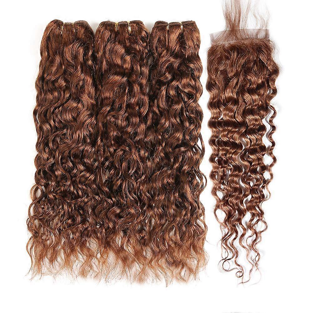 30# Brown Water Wave Human Hair Bundles with Closure Peruvian Virgin Pre Colored Wet and Wavy Set