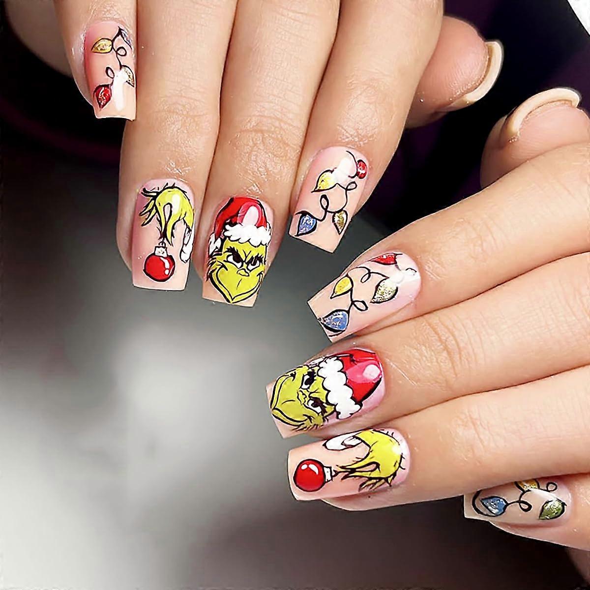 Christmas Press on Nails Square with Colorful Winter Art, Artificial Acrylic, 24 Pcs