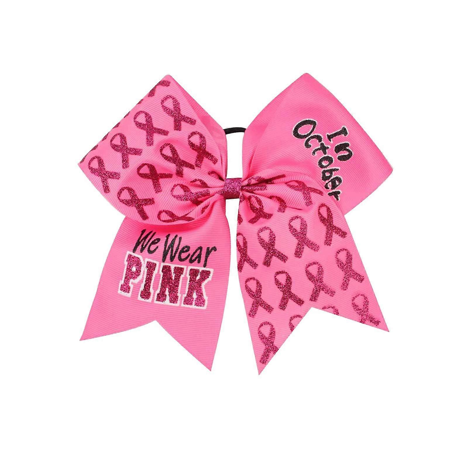 Breast Awareness Cheer Bow Pink Glitter 7 Inch Grosgrain Ribbon with Elastic Hair Tie