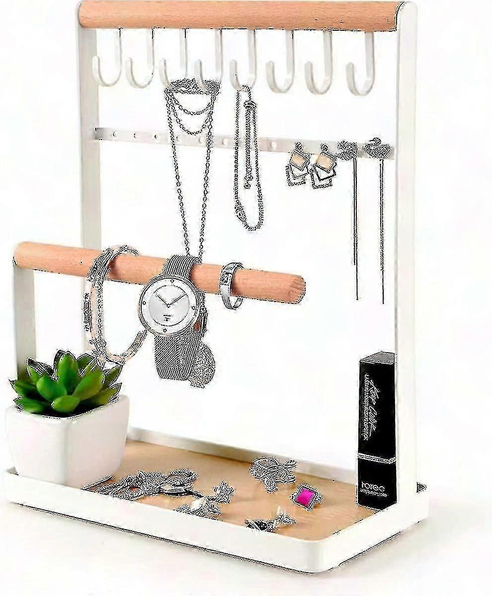 3-Tier Tabletop Jewelry Stand Holder - Elegant Necklace & Bracelet Organizer | Metal Frame, Natural Wood Bars, White Finish