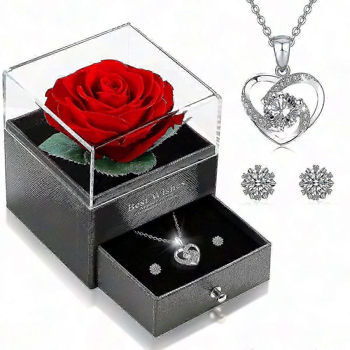 Eternal Real Rose Gift Set - Heart Necklace & Earrings Jewellery Box | Preserved Red Rose, Silver-Tone | Romantic Valentine's Day Gift for Her