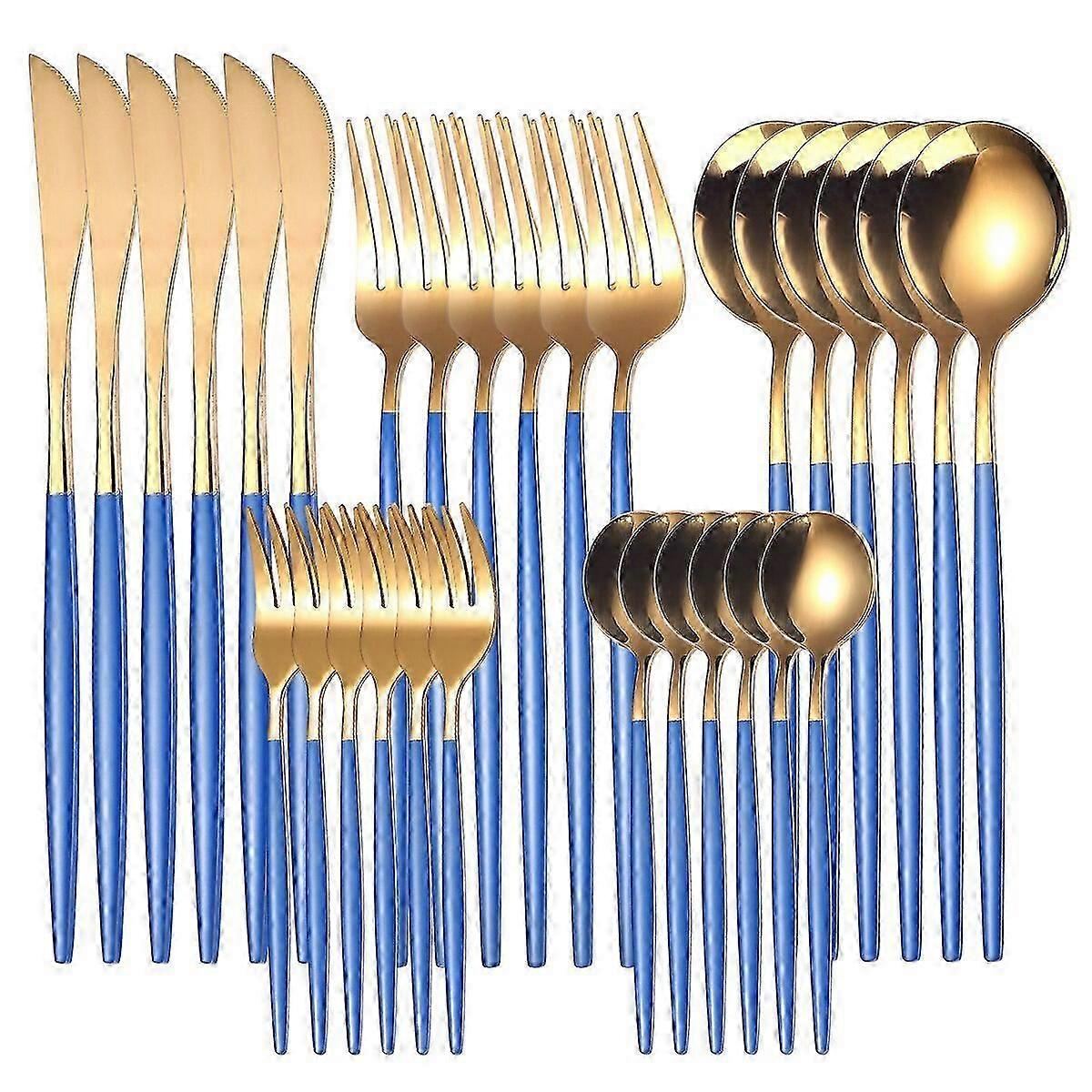 30pcs Gold Stainless Steel Dinnerware Set Steak Knife Fork Coffee Spoon Teaspoon Dishwasher Safe Flatware Kitchen Cutlery Set szsh02Blue gold