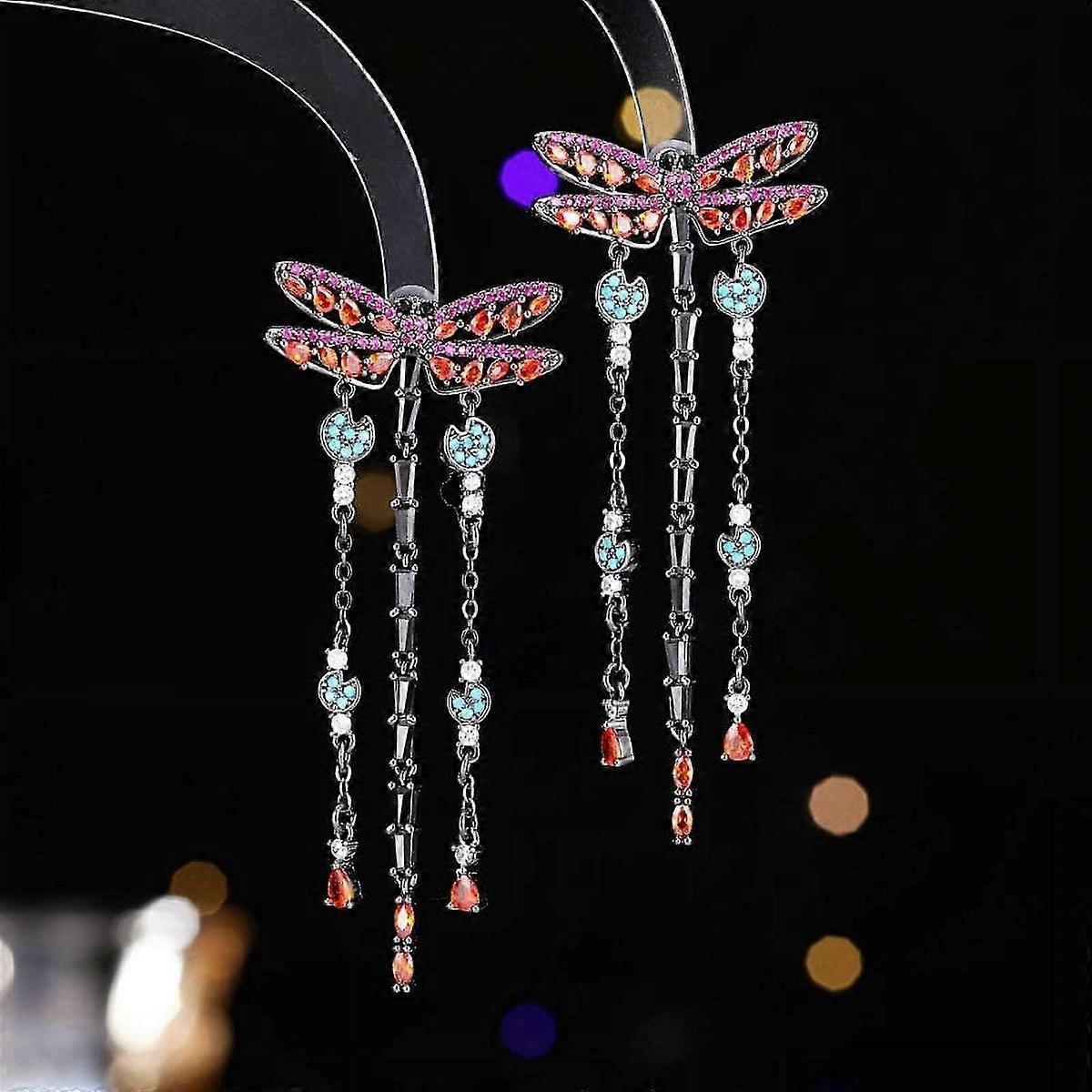 Luxury Dragonfly Earrings with Zircon Inlay and Tassel for Women