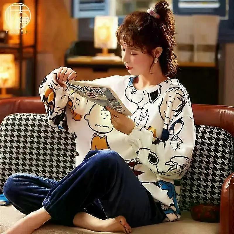 Snoopy Pajama Women Winter Coral Fleece Long Sleeve Pant sleepcoat Plus Fleece Thickened Flannel Cute Sleepwear girl nightgown