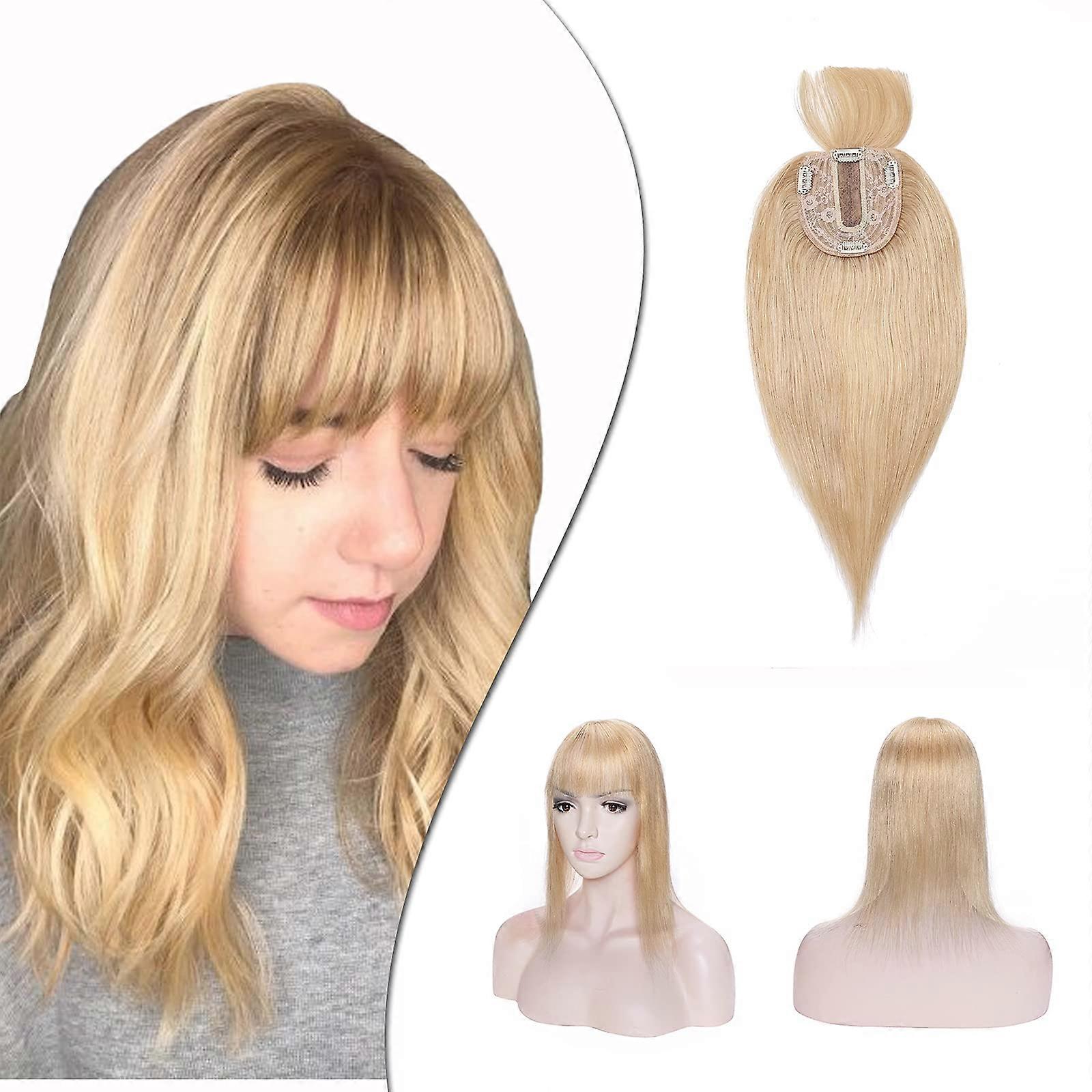 Human Hair Topper with Bangs Silk Base Clip In Crown Topper Natural Blonde Remy 10 Inch 35g
