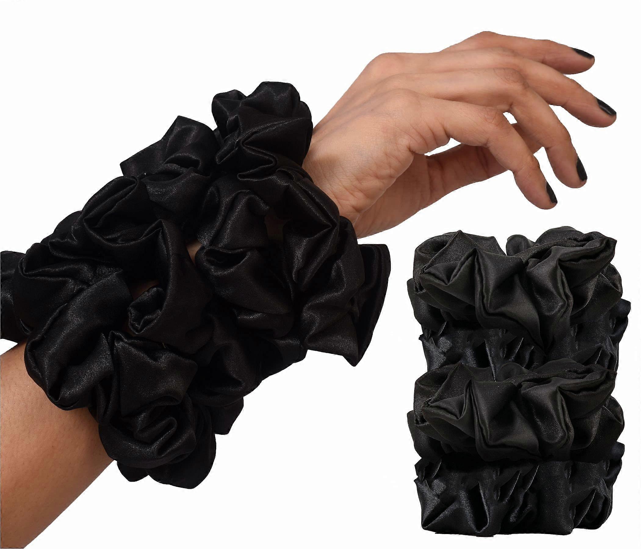 Soft satin silk scrunchies designed for everyday use and gentle styling. Set of 4, black, large. Why choose these scrunchies Gentle on hair: silky satin outer fabric glides over strands to reduce tugging and tight creases during wear. Secure hold: elastic core stretches to fit and hold ponytails, buns, and updos without constant readjusting. Versatile size: large design accommodates thick or long hair while still working well for medium or fine hair with multiple wraps. Comfortable for allday wear: soft fabric and balanced tension sit comfortably at the scalp for daytime activities and sleep. Key features Material: smooth satin silk finish with durable elastic inside for stretch and recovery. Quantity and color: set of 4 scrunchies, black, large. Compatibility: suitable for women, girls, and children; works with straight, wavy, curly, and coily hair textures. Function: ideal for ponytails, buns, knots, halfup styles, and low gathers. Practical use scenarios Daily commute or work: keep hair neatly secured in a low bun or ponytail without constant pulling or discomfort. Exercise and active days: hold hair in place during gym sessions, yoga, or outdoor activities while remaining soft against the scalp. Evening and sleep: wear a loose or low ponytail to reduce pressure and visible creases by morning. Care and handling Hand wash or gentle machine wash on a delicate cycle. Lay flat or hang to dry to preserve the satin finish and elastic performance. Rotate among the four scrunchies to extend their lifespan and maintain consistent hold. What you get Four large, black satin silk scrunchies that combine soft fabric with reliable elastic for comfortable, easy styling across a range of hair types and occasions.