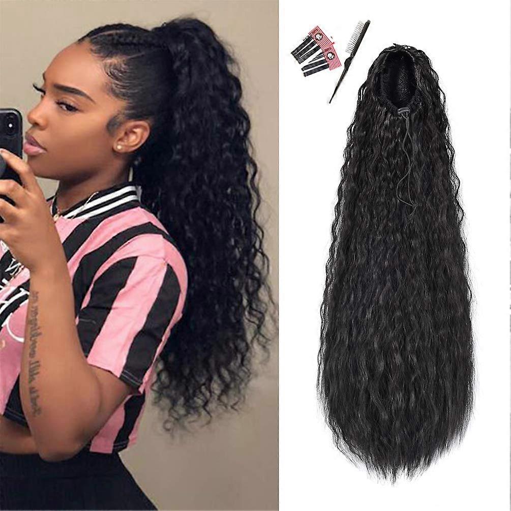 22' Drawstring Ponytail for Black Women, Natural Black Corn Wavy Synthetic Hair Extension 1B