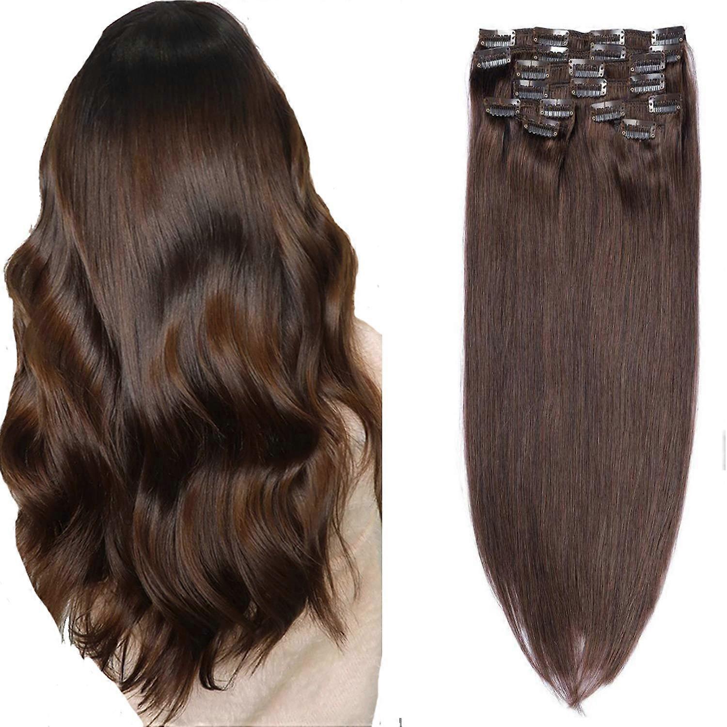 14 Inch Medium Brown Clip in Human Hair Extensions Double Weft Remy Thick Straight 100g Set
