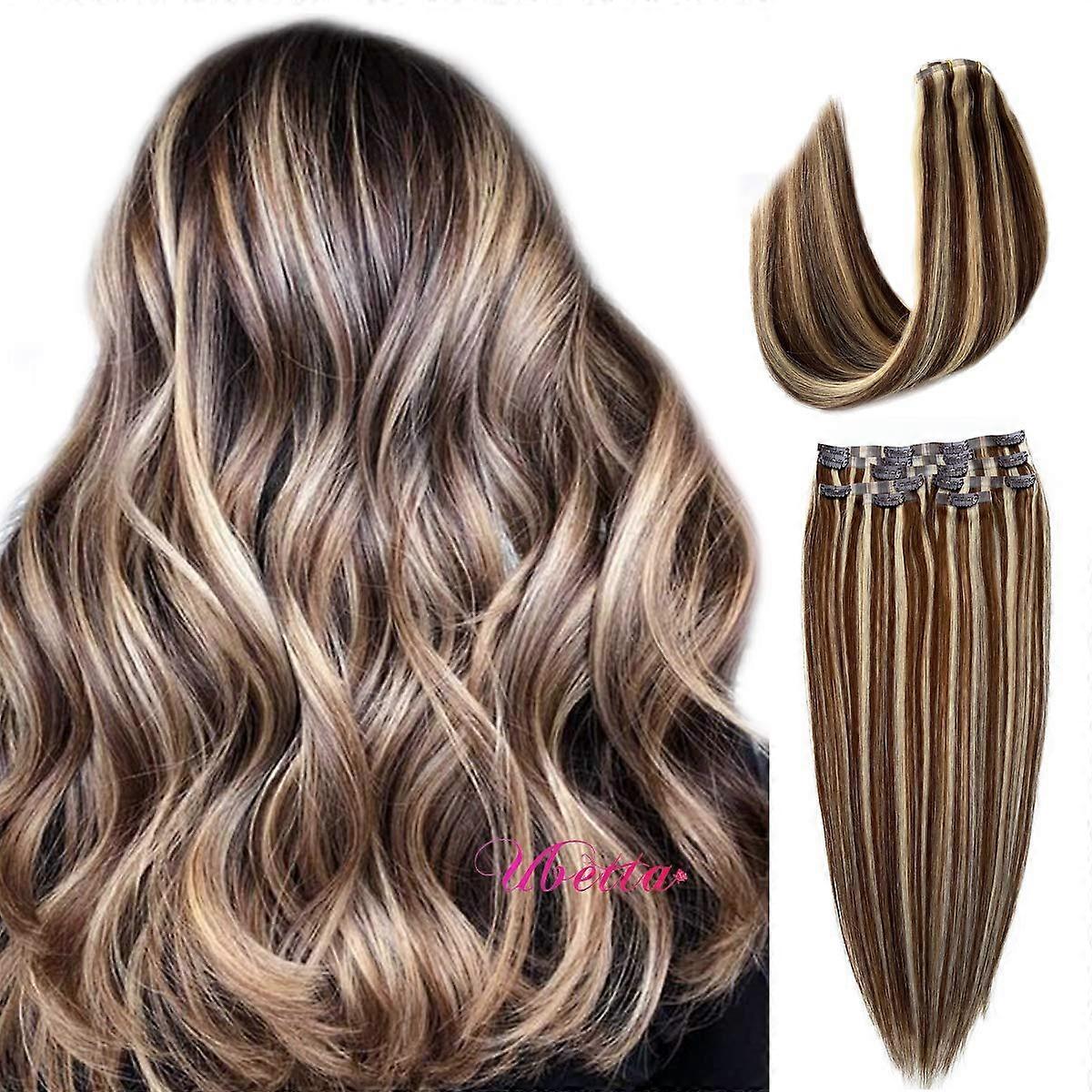 Human Hair Clip in Extensions Brown with Blonde Highlights 22 Inch Silky Straight Invisible PU Weft
