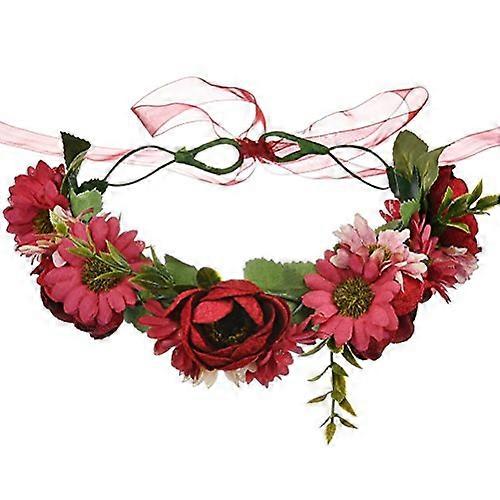 Boho Red Flower Crown with Realistic Handmade Flowers and Adjustable Ribbon for Wedding Festival