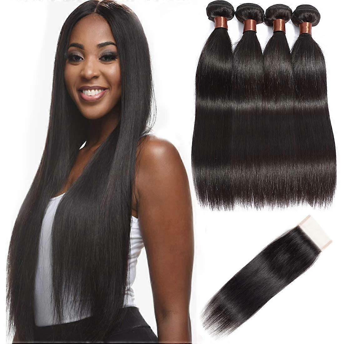 Brazilian Virgin Straight Human Hair Bundles with 4x4 Lace Closure Natural Black Unprocessed