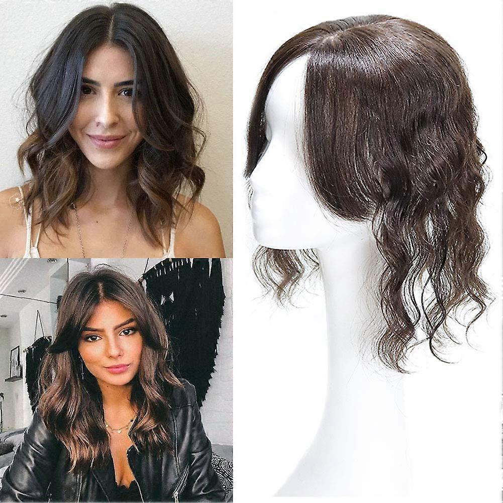 100% Human Hair Clip in Topper Wiglet with Wispy Bangs, Seamless Water Wave U Part, Brown 25cm