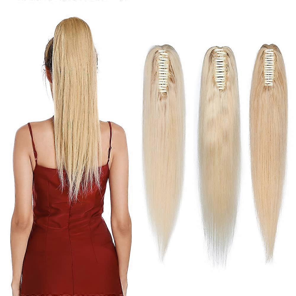 16 Inch Bleach Blonde Remy Human Hair Ponytail Extension with Claw Clip, Natural Straight
