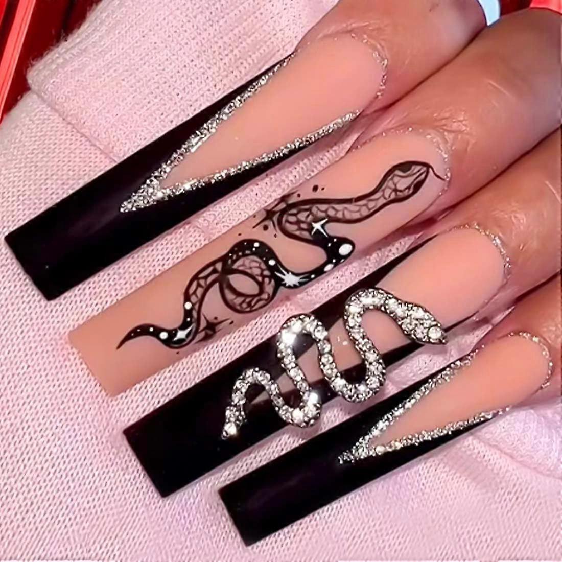 Long Coffin Press On Nails with Black French Tips and Snake Rhinestones, Reusable Fake Nails 24pcs
