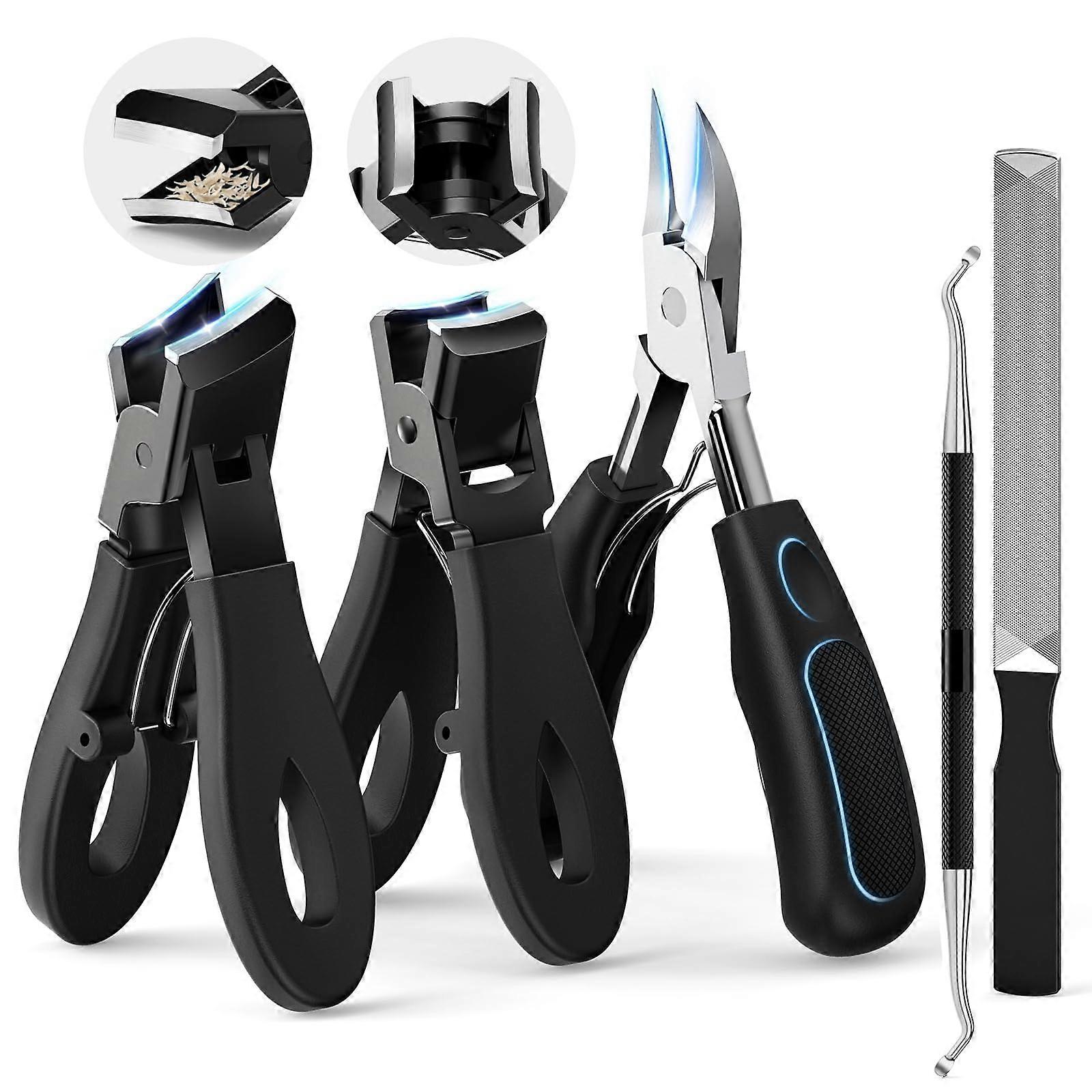 Professionalgrade 5in1 toenail clipper set designed for precise, comfortable trimming and easy storage. What you get 1 large longhandled toenail clipper 1 wide opening straight nail clipper 1 wide jaw angled nail clipper 1 nail file 1 ingrown toenail lifter 1 portable storage bag Key benefits Durable, corrosionresistant construction: All tools are made from stainless steel for longlasting use. Extrasharp, precise cutting edges: Sharp blades provide smooth, accurate cuts for cleaner trims and reduced splitting. Wide opening capacity: Curved blade with a 25 degree angle opens up to 1.6 inches to handle thick nails; wide jaw clippers open up to 0.5 inches for thicker or hardertoreach edges. Reduced cutting effort: Innovative lever design lowers the force required to clip, making it easier to trim hard or thick nails. Ergonomic handling: Long handle and bionic angled head reduce the need to bend and improve reach, helpful for users with limited mobility or back discomfort. Secure grip: Wide, nonslip handles for stable control and safer trimming. Neat trimming: Antisplash style design helps contain clippings and keeps the area cleaner. Portable and organized: Compact bag stores all tools for travel or athome use. How it solves common problems Thick or hard nails: Wideopening blades and strong lever mechanics make cutting thick toenails manageable without repeated snips. Tight or angled edges: Angled and curved clippers reach side nails and curved nail edges more easily than standard clippers. Ingrown nail management: The included lifter and angled tool help access and lift edges safely during routine nail care. Limited mobility or bending: Longhandled, ergonomic tools let users trim nails while seated, reducing stretching and leaning. Practical use scenarios Athome pedicure: Use the longhandled clipper and angled jaw to trim and shape toenails, follow with the file for smoothing edges, and store tools in the bag. Seniors or limited mobility users: Sit comfortably while using the longhandle clipper and angled head to reach toenails without excessive bending. Thick or ingrown nails: Open the wide curved clipper for tough nails, and use the ingrown toenail lifter to lift nail edges for careful trimming. Specifications Material: stainless steel Curved blade angle: 25 degrees, opens up to 1.6 inches Wide jaw opening: up to 0.5 inches Handle: Wide nonslip design Kit includes: 6 pieces total including storage bag Suitable for men, women, and seniors who need reliable tools for toenail and side nail trimming. Simple to use, easy to store, and built for precise, controlled trimming.