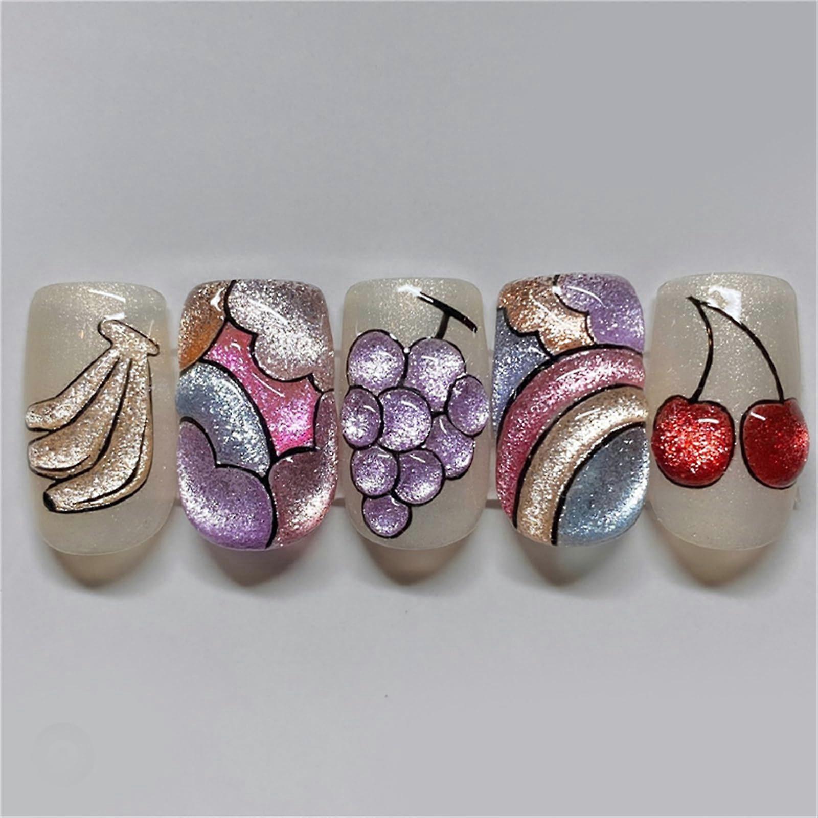 Short Square Press On Nails Rainbow Fruit Cat's Eye Nail Art Set with Jelly Glue 24pcs