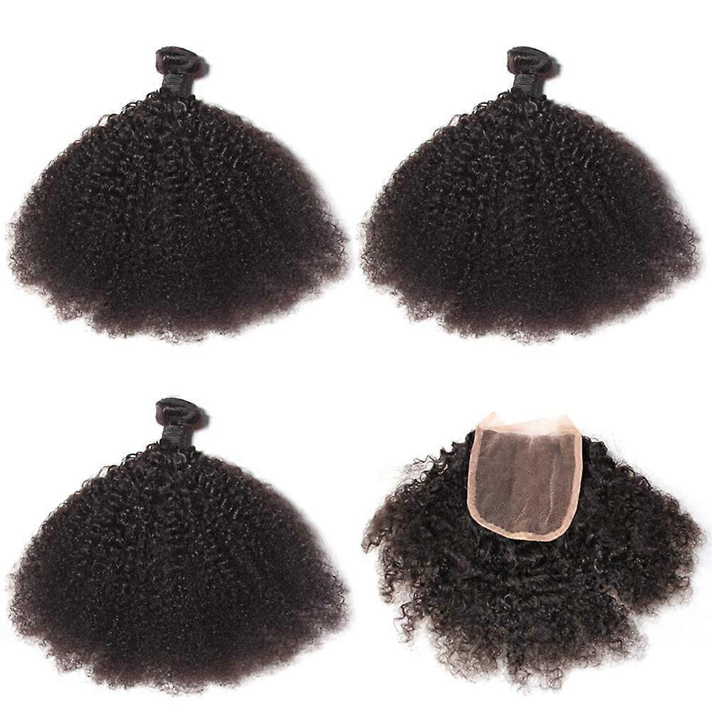 Afro Kinky Curly Human Hair Bundles with Closure Natural Black Virgin Brazilian Weave 12 14 16+10 Inch