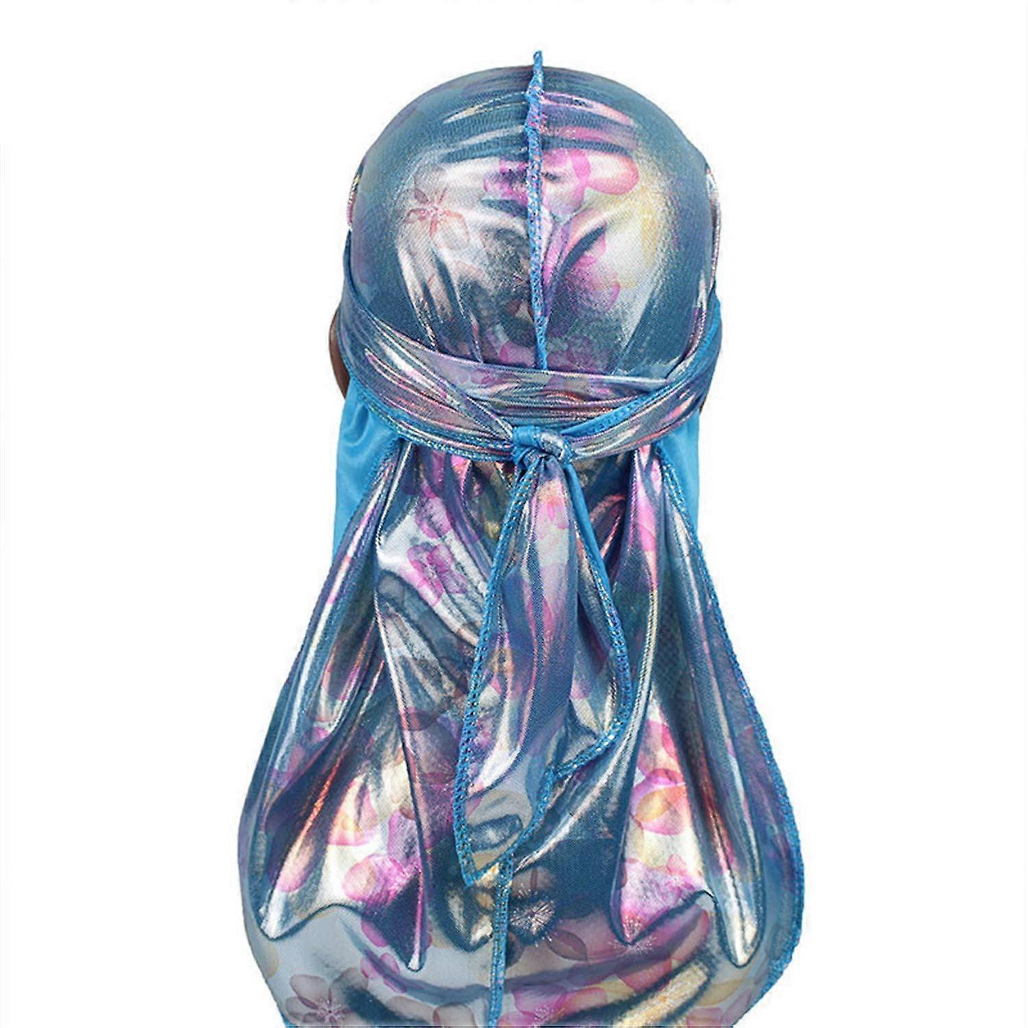 Sky Blue Silk Floral Durag for Men with Long Tail, Smooth Texture, Lightweight Comfortable Fit