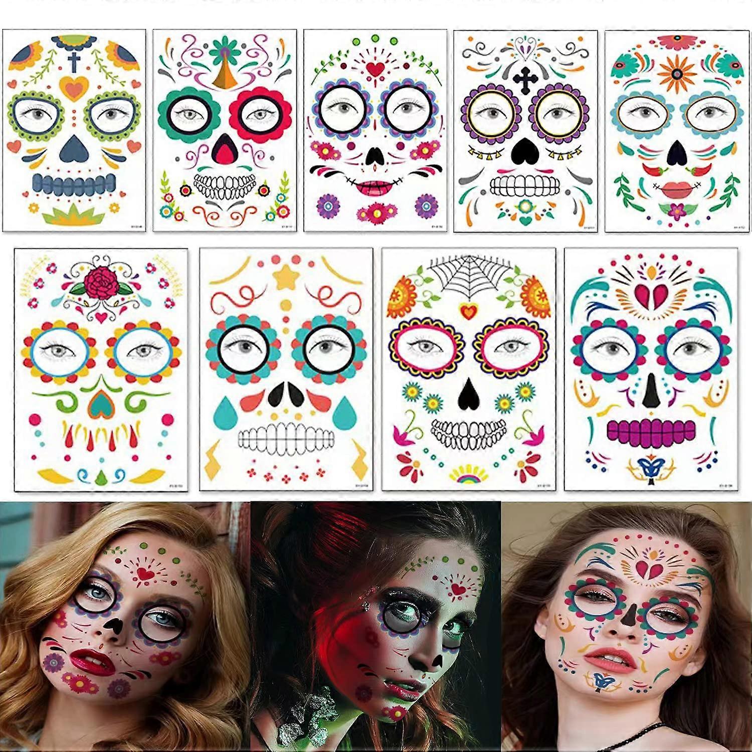 Halloween Face Tattoos Stickers Set, 9 Pcs Waterproof Sugar Skull Temporary Face Mask for Day of the Dead or Halloween Costume