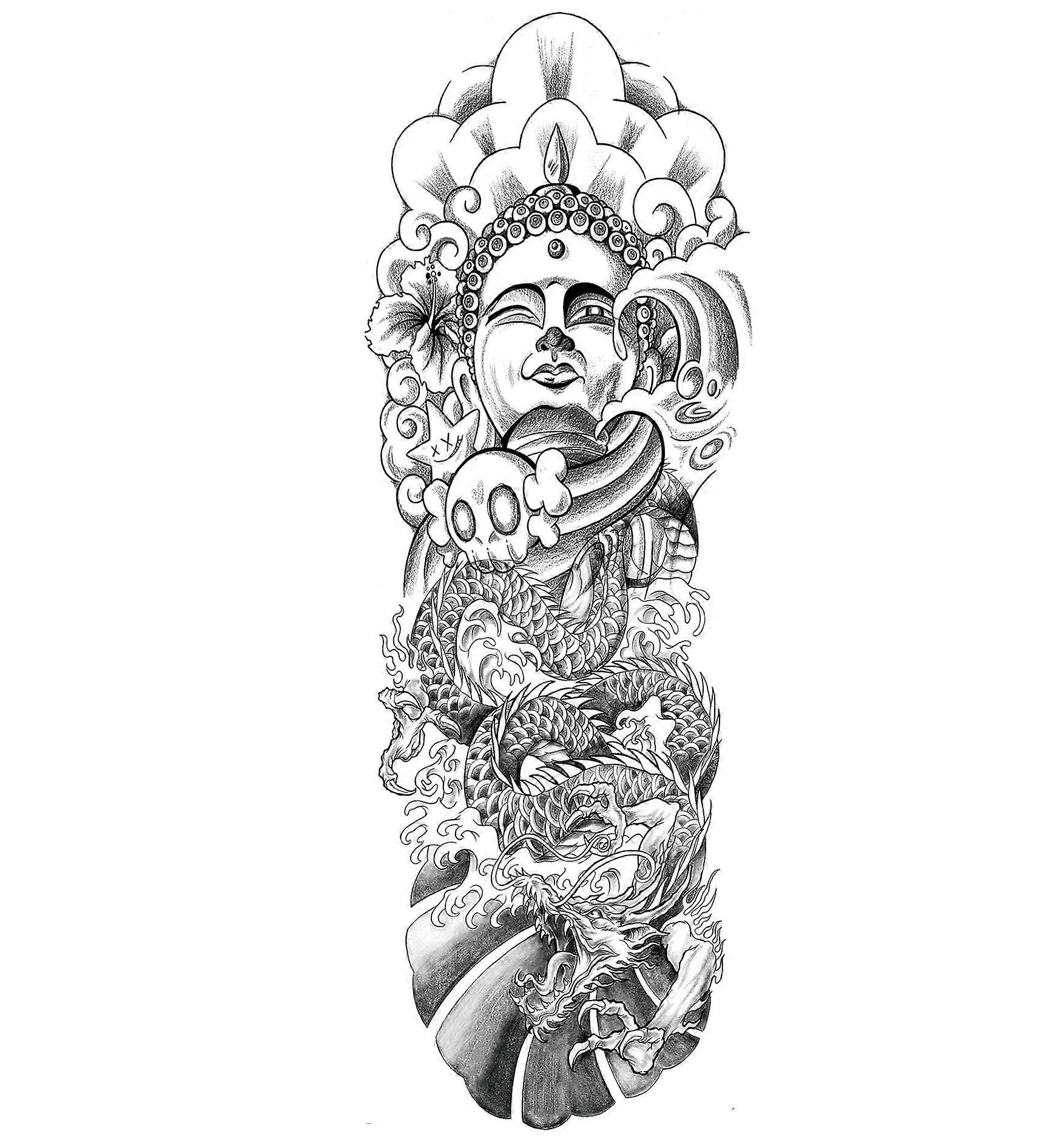 6 Sheets Waterproof Full Arm Temporary Tattoos, Skull and Buddha Sleeve 17x48cm Large Stickers