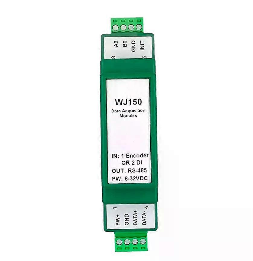 RS485 1Channel Encoder Pulse Signal Counter or 2ch DI High-speed Counter Modbus RTU Module 1-channel encoder pulse counter or 2-channel Di high-speed counter, Modbus RTU module WJ150 Product features : ● encoder decoding and conversion to standard Modbus RTU protocol ● it can be used as encoder counter or speed measurement ● support encoder counting and identify positive and negative rotation ● it can also be set as 2-channel independent Di high-speed counter ● the count value supports automatic saving in case of power failure ● Di input supports PNP and NPN inputs ● the filtering time can be set when the relay and mechanical switch are input ● reset and set the count value through RS-485 interface ● wide power supply range: 8 ~ 32vdc ● high reliability, convenient programming and easy application ● standard din35 guide rail installation is convenient for centralized wiring ● the user can programmatically set the module address, baud rate, etc Typical application : encoder pulse signal measurement flowmeter pulse counting or flow measurement line product count logistics package count proximity switch pulse signal measurement encoder signal is transmitted to industrial computer remotely pulse counting of water meter or electricity meter intelligent factory and industrial Internet of things Product overview: Wj150 product realizes signal acquisition between sensor and host, which is used to decode encoder signal. Wj150 series products can be applied to RS-485 bus industrial automation control system, automatic machine tools, industrial robots, three coordinate positioning system, displacement measurement, stroke measurement, angle measurement, speed measurement, flow measurement, product counting, etc. Products include signal isolation, pulse signal capture, signal conversion and RS-485 serial communication. Each serial port can be connected with 255 wj150 series modules at most. The communication mode adopts ASCII code communication protocol or Modbus RTU communication protocol. The baud rate can be set by code and can be hung on the same RS-485 bus with the control modules of other manufacturers, which is convenient for computer programming. Wj150 series products are intelligent monitoring and control system based on single chip microcomputer. All configuration information set by users, such as address, baud rate, data format, checksum status and so on, are stored in nonvolatile memory EEPROM. Wj150 series products are designed and manufactured according to industrial standards, with no isolation between signal input / output, strong anti-interference ability and high reliability. Operating temperature range - 45 ℃ ~ + 85 ℃. Function introduction: Wj150 remote I / O module can be used to measure 1 channel encoder signal, or set as 2 channels of independent counter or di status measurement. 1. Signal input One channel encoder signal input or two independent counters can be connected to dry contact and wet contact, and the input type can be set by command. 2. Communication protocol