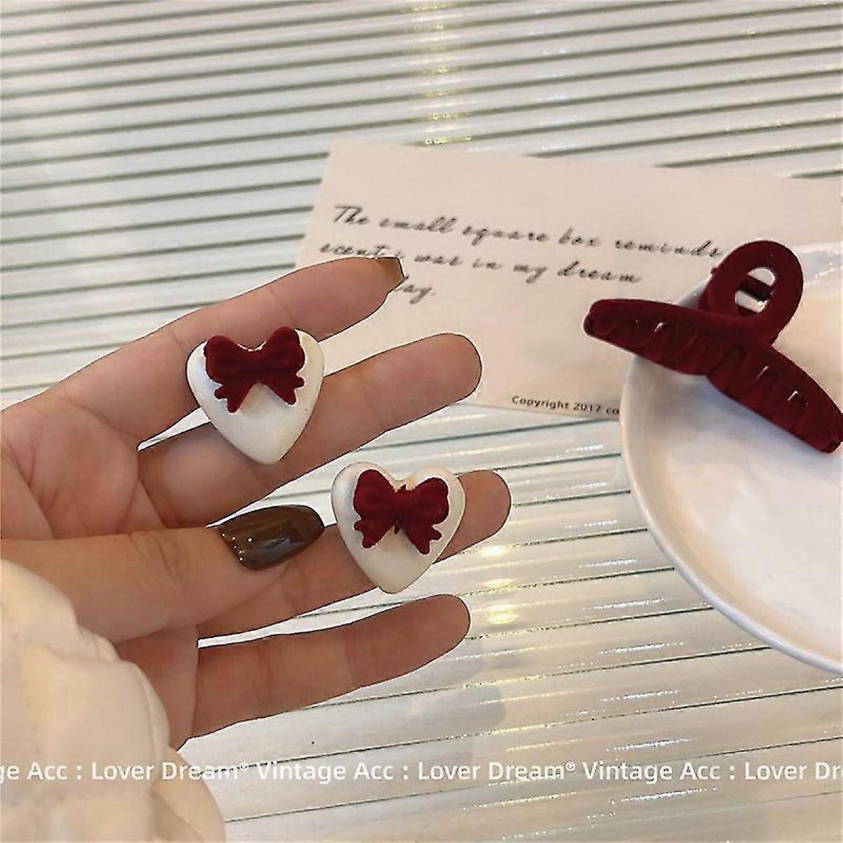 Autumn Winter Red Flocking Plush Ball Bow Earrings for Women