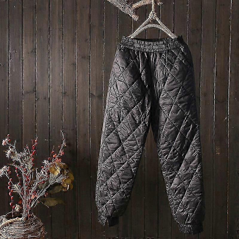 Women's winter pants designed for windproof and warm wear, made of polyester material. Features ultra-light quilted design, elastic high waist, and casual baggy fit. Available in sizes XS to 4XL with detailed size chart provided. Care instructions: Hand wash cold, iron at normal temperature