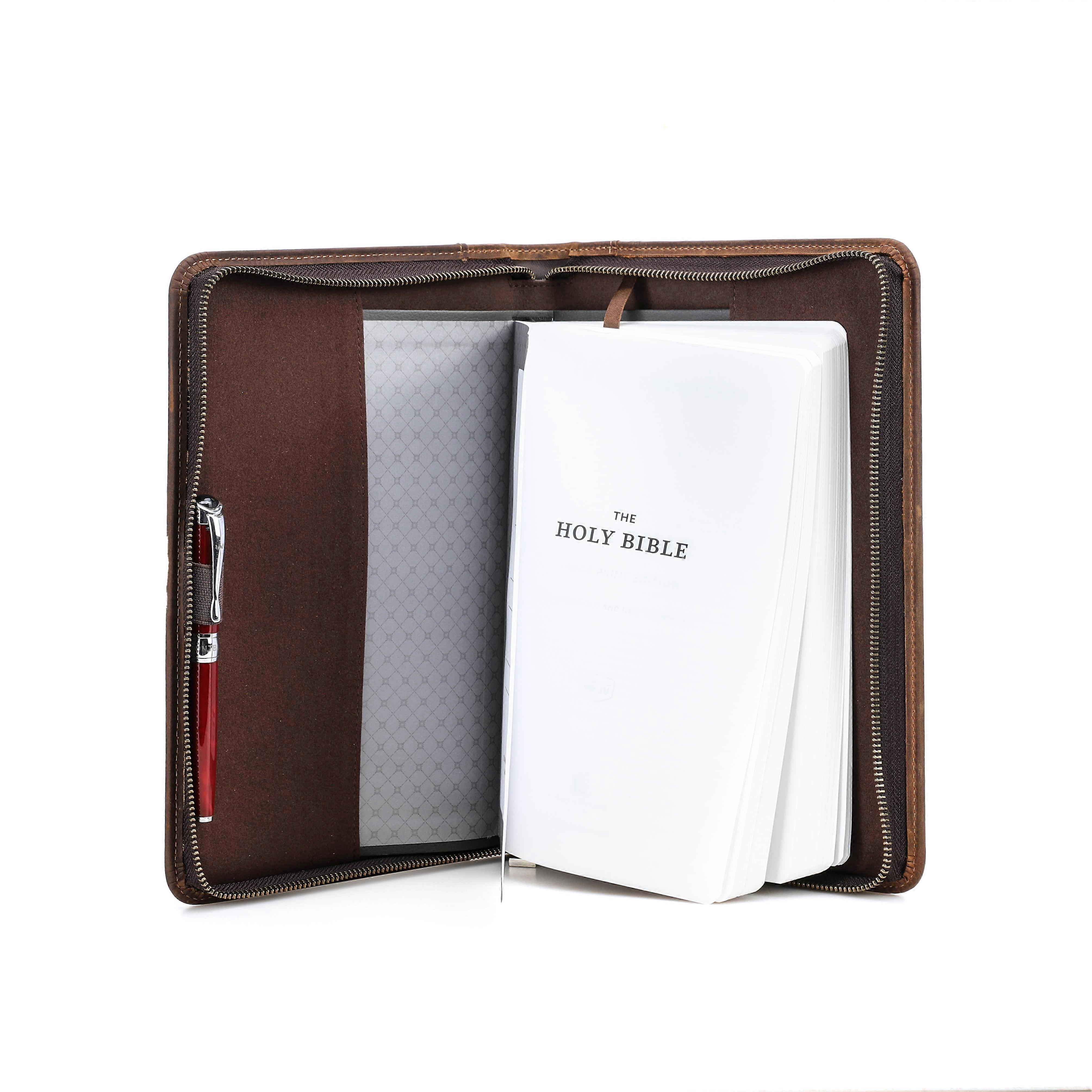 This handmade custom cowhide leather book cover bible case is the perfect travel companion. It not only features an elegant appearance but also offers a multifunctional design, including a pen holder, phone pocket, and wrist strap for easy carrying. With dimensions of 281x196x35mm, it is suitable for various occasions such as business meetings, travel, or daily office use. Made from high-quality genuine leather, it ensures durability and style. Whether as a gift or for personal use, this product meets your needs.