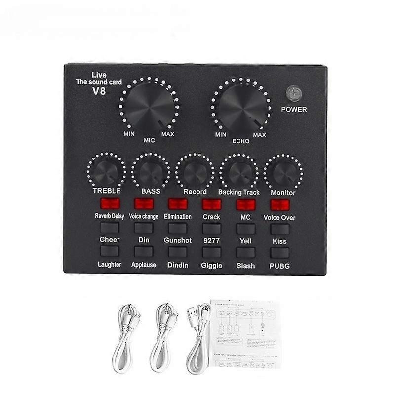 The V8/V8S USB Audio Mixer is a versatile external sound card designed for live streaming, webcasting, gaming, and professional audio recording. Compatible with both PC and mobile devices (phones/tablets), it delivers high-quality audio processing with real-time effects, making it ideal for content creators, podcasters, and musicians. Key Features: / Multi-Device Compatibility – Works seamlessly with Windows, Mac, Android, and iOS via USB connection. / Real-Time Audio Mixing – Adjust microphone volume, background music, and sound effects independently for professional-level control. / Built-in Sound Effects – Enhance your voice with reverb, echo, and voice-changing modes for dynamic live performances. / Plug-and-Play Setup – No drivers required; simply connect to your computer, phone, or tablet and start streaming. / Headset / Microphone Support – Includes a 3.5mm mic/headphone jack for clear voice input and monitoring. / Noise Reduction – Reduces background noise for crisp, studio-quality audio. / Compact / Portable – Lightweight design perfect for on-the-go streaming or home studio setups. Ideal For: 🔹 Live Streaming (Twitch, YouTube, Facebook) 🔹 Podcasting / Voice-Over Recording 🔹 Gaming / Voice Chat (Discord, Zoom, etc.) 🔹 Karaoke / Music Performances Upgrade your audio production with the V8/V8S USB Mixer – the ultimate plug-and-play solution for crystal-clear sound in any broadcast!