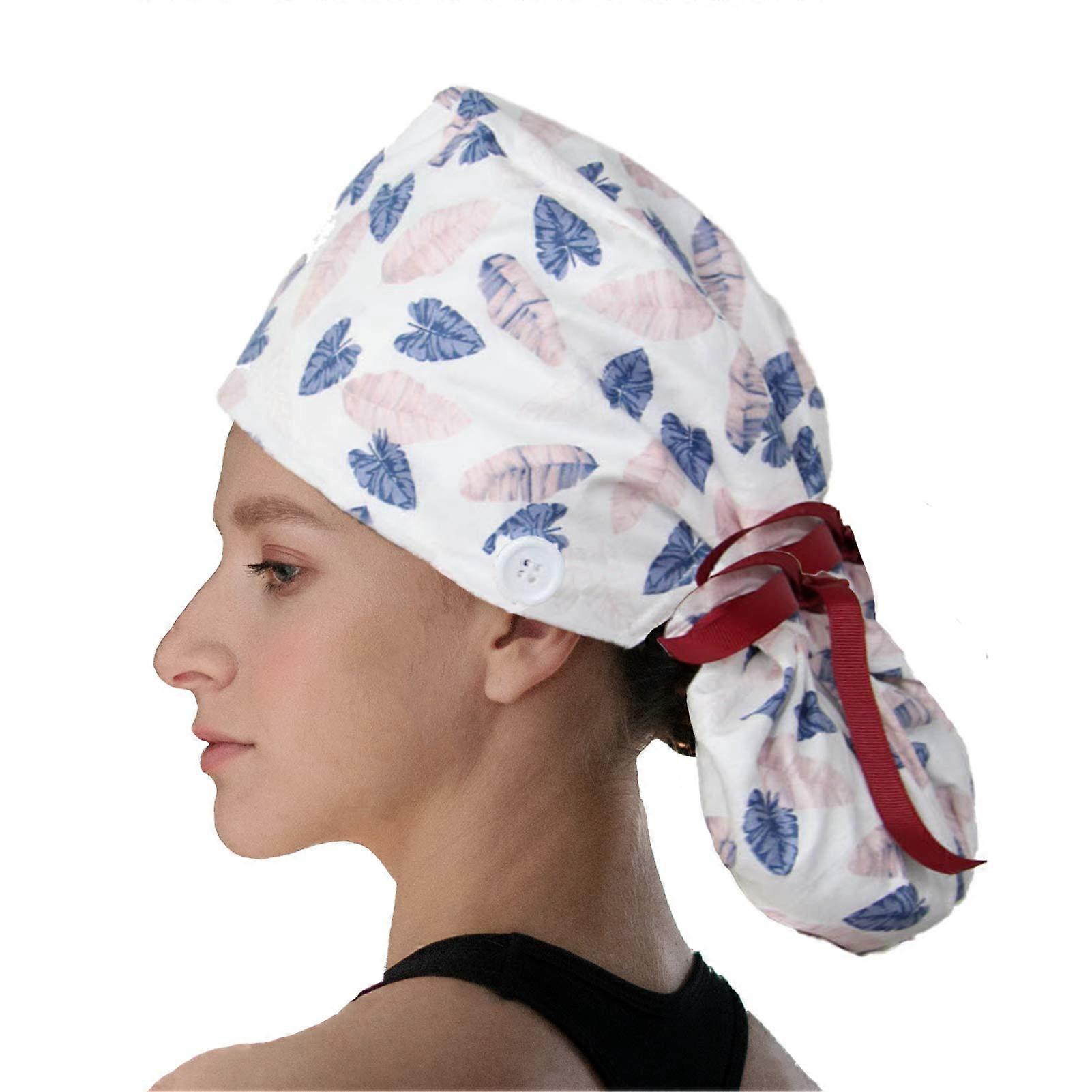 Ponytail Scrub Cap with Buttons and Ribbon Ties Sweatband for Long Hair Women Men