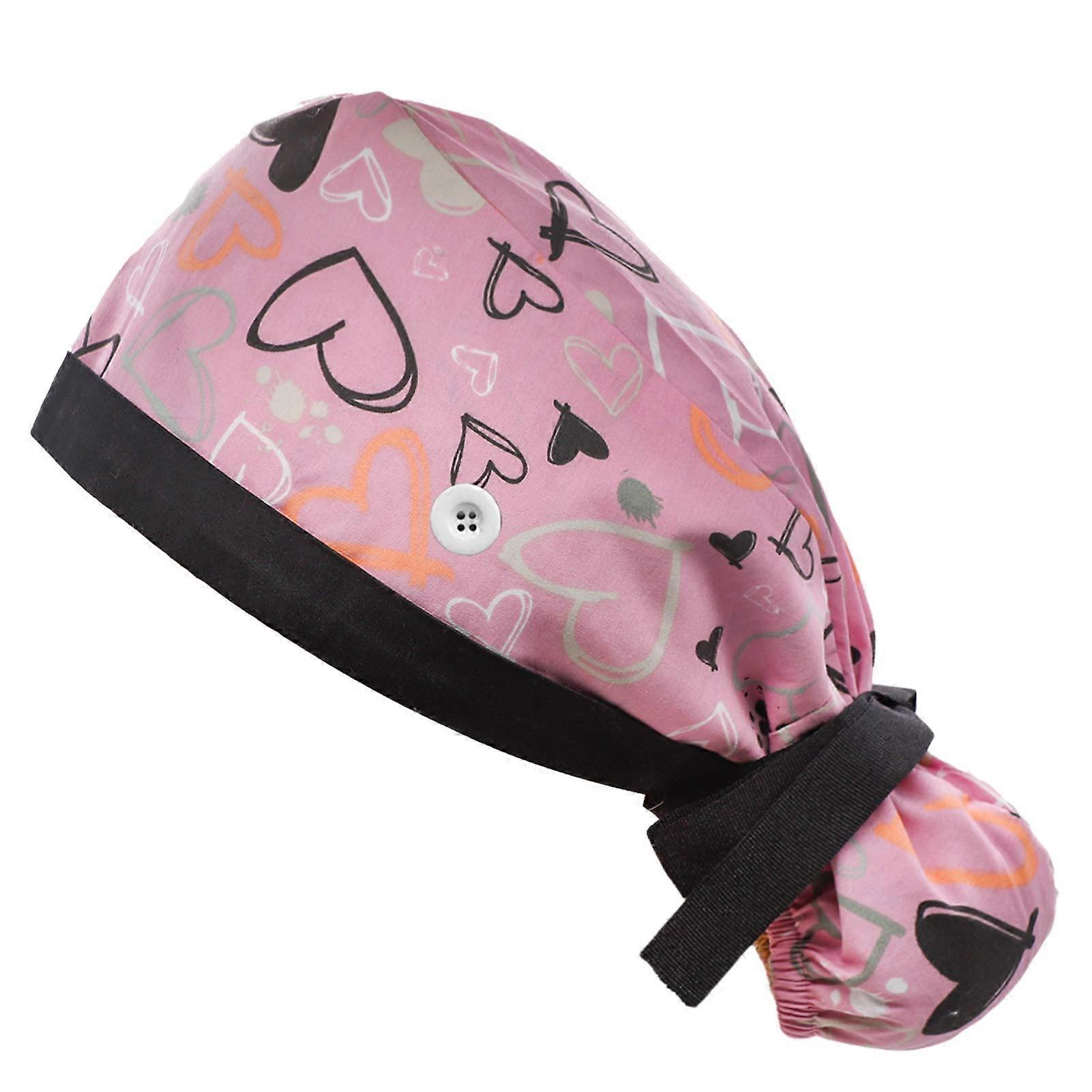 Scrub Cap with Buttons and Sweatband, Cotton Ponytail Surgical Cap for Women Long Hair Pink Love Heart