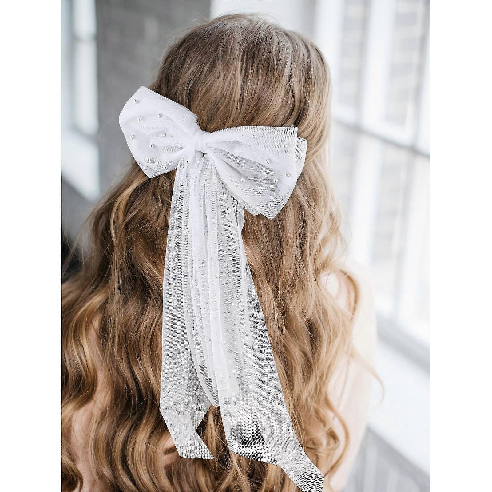 Single White Bow Veil hair clip designed for brides and bridal events. A simple, elegant accessory that adds a pearlaccented touch to a variety of hairstyles. Key benefits Elegant pearl detail: 33 quality pearls provide a soft, attractive sheen that complements both classic and modern looks. Lightweight, singlelayer tulle: soft and wrinkleresistant for a smooth appearance straight from the box. Secure and easy to wear: quality hair clip keeps the veil in place and allows quick styling with hair up or down. Versatile size: 8 in wide by 18.5 in long fits a range of hairstyles and works with formal dresses or casual jeans. Multiuse accessory: suitable for brides, bridesmaids, flower girls, bachelorette parties, bridal showers, proms, costume events, and more. Material and performance Fabric: singlelayer tulle that is lightweight and holds shape without heavy volume. Embellishments: 33 pearls sewn onto the bow for consistent luster. Fastening: durable clip designed for secure hold and simple attachment to different hair types. Practical use scenarios Wedding day accessory: attach to a low bun or loose waves to complete a simple bridal look during the ceremony and reception. Bachelorette party decoration and wear: clip on for photos and group events to signal the bride while remaining comfortable for long wear. Casual to formal styling: pair with a cocktail dress or jeans for prewedding events, photo sessions, or themed parties. Care tips Store flat to avoid creasing. For light cleaning, spot wash gently and air dry. Handle the pearls and clip carefully to maintain appearance and secure attachment. A straightforward, elegant veil option that combines lightweight tulle, delicate pearl detailing, and a reliable clip for versatile bridal styling.