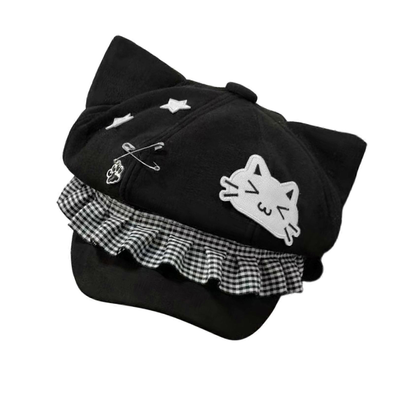 Punk Beret Kitten Ear Unisex Headwear Accessory for Women Men Cabbie Hat for Halloween Cosplay Party Outfit blackplaid