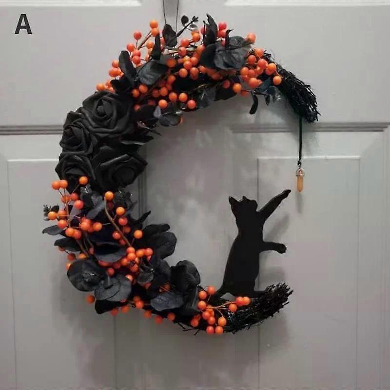 Halloween Moon Cat Garland with Rose Black Decorations Halloween Garland Halloween Wreath for Front Door Halloween Door Decor