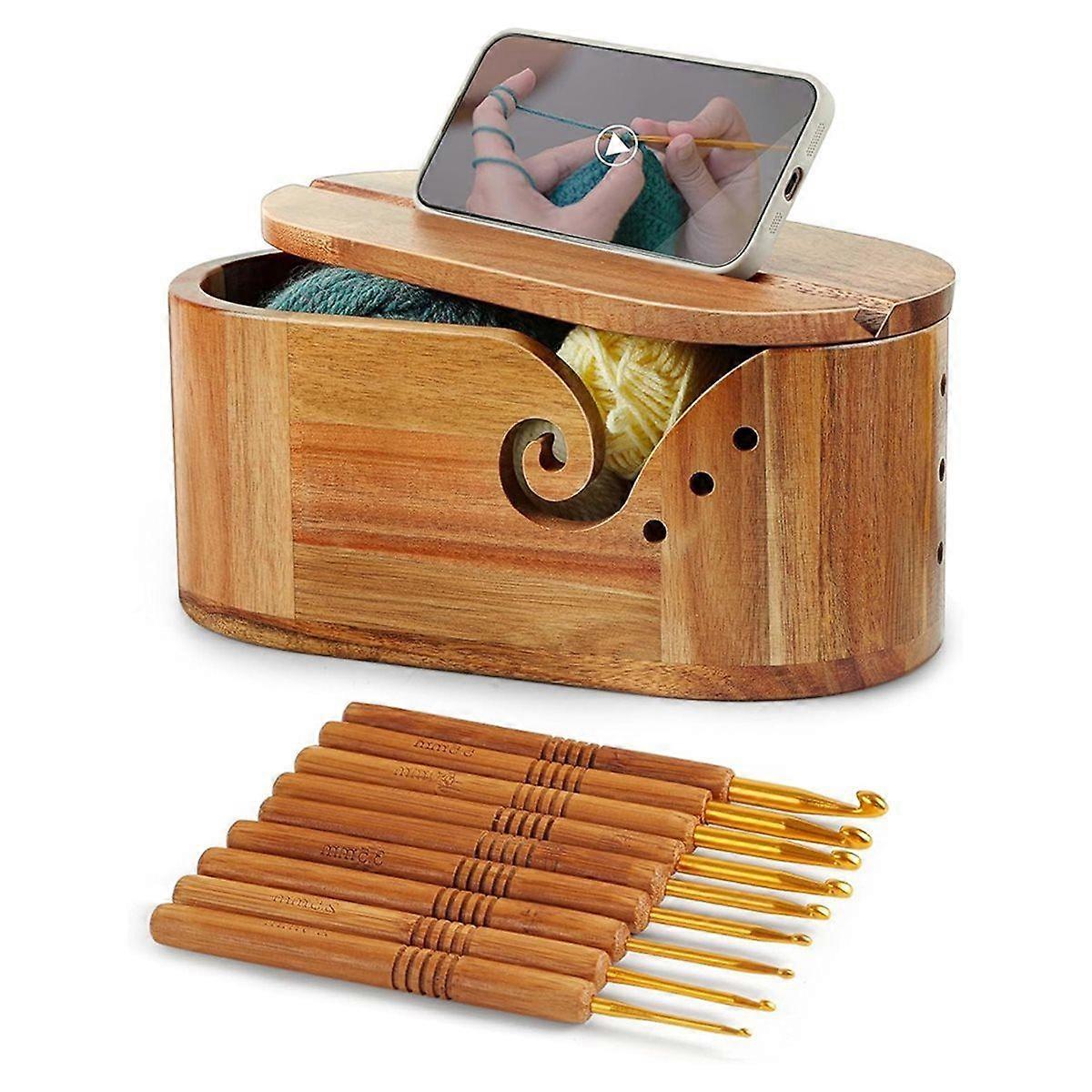 Wooden Yarn Bowl with 9pcs Crochet Hooks, Large Oval Yarn Holder for Knitting and Crocheting for Cro