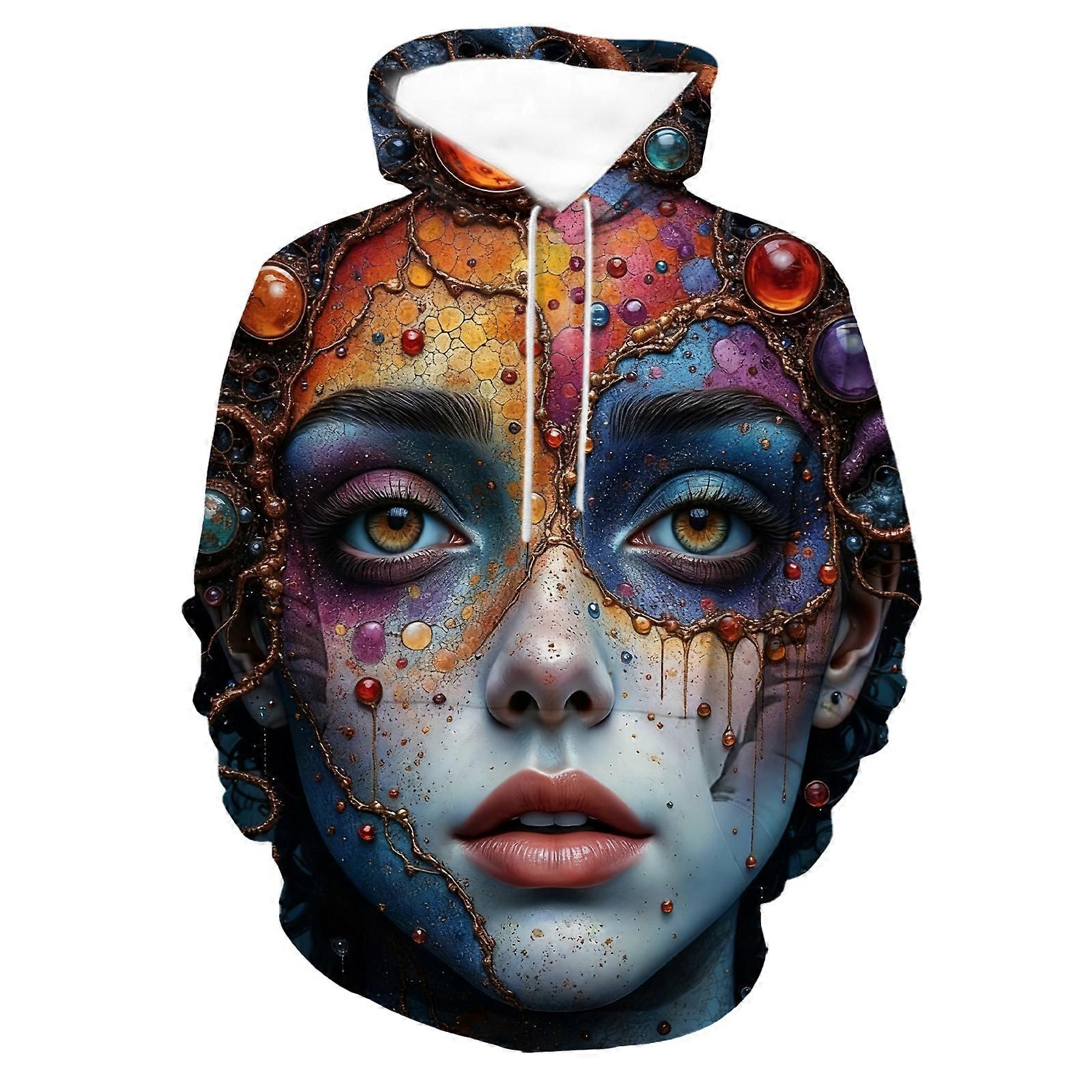 Men's Vibrant Psychedelic Portrait Graphic Hoodie Colorful Mixed-Media Print Pullover Bold Statement Sweatshirt