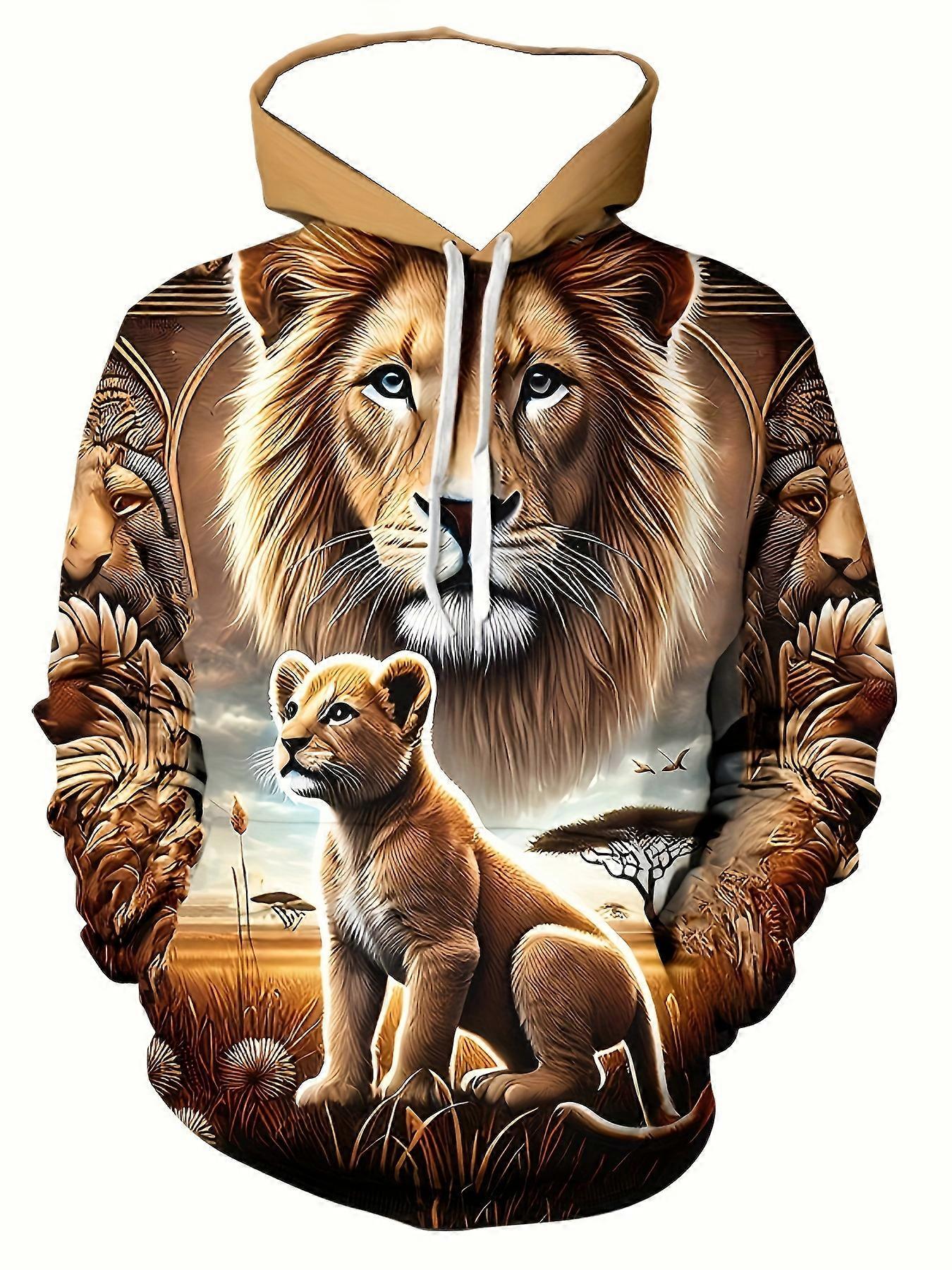 Men's Safari Lion & Cub Graphic Hoodie Earth Tone Art Print Pullover Bold Casual Sweatshirt