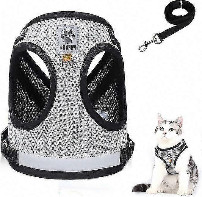 Suitable SizeYou will receive gray S size (Chest: 30-34cm ) cat harness with 1.5m long leash. Please measure your pet's chest accurately before purchasing, so that your pet can have a better wearing experience. For the best wearing experience, we recommend that you reducing 2~3 cm to the measured value.High Quality Breathable MaterialOur cat harness with lead set is made of high quality polyester-polyester double-layer mesh, which is soft and body-hugging, the breathable mesh with large holes has better breathability, and the vest-style cat vest can evenly distribute the pressure of the shoulder straps on the chest and shoulders, avoid choking or overexertion, keep your cat/dog comfortable and will not damage the fur.Security and Loss PreventionThe newly designed cat harness escape proof adds a hanging ring on the chest, which can be used to hang a lost card or night light; the double D-ring design on the back is more secure and stable; the double protection of velcro and hasp can prevent a beloved pet from escaping and getting lost.360 Degree Reflective Tape DesignThe escape-proof adjustable soft mesh vest harnesses has reflective tapes on the chest and edges, especially the 360 degree reflective tape design on the edges, which makes cats more visible in low light conditions and safety when driving at night improved.Adjustable ComfortThe adjustable soft cat walking jackets has an adjustable buckle that can be adjusted according to the actual effect, giving cats better comfort. Whether it's at home or going out, the cat harness with leash is a good helper for you and your cat (the kitten is an escape expert, please be patient and get used to wearing cat harnesses).