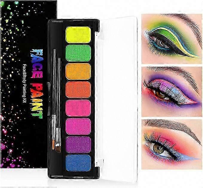 FLUORESCENT COLORS, GLOW IN THE DARK BRIGHTNESS: Contains 8 highly saturated fluorescent colors that create a dreamy glow effect under UV light, making night parties even more eye-catching! Easily create themed looks for Halloween, music festivals, and more, making your child the center of attention!SAFE, NON-TOXIC AND SOFT ON SKIN: Made with safe and healthy ingredients, its water-based formula is hypoallergenic and non-irritating, making it suitable for children and people with sensitive skin. We recommend testing on a small area before use for peace of mindEASY TO COLOR, QUICK DRYING, LONG LASTING: Water soluble pigments are easy to blend and apply smoothly with a professional brush, drying quickly without fading. They adhere to the skin permanently, even with sweat. They are easily removed with warm water after use, leaving no residueA BOX FOR MULTIPLE USES, INSPIRING CREATIVITY: Individual boxes are portable and practical, while double boxes double the color palette. Use individual colors or mix them freely, creating a wide range of custom combinations for every occasionPARTY MUST-HAVE, SHARED FUN - Great for Halloween, birthdays, cosplay, theatrical performances and more, they are great for festive costumes and parent-child interactions, inspiring children's imagination and creating unique creative experiences