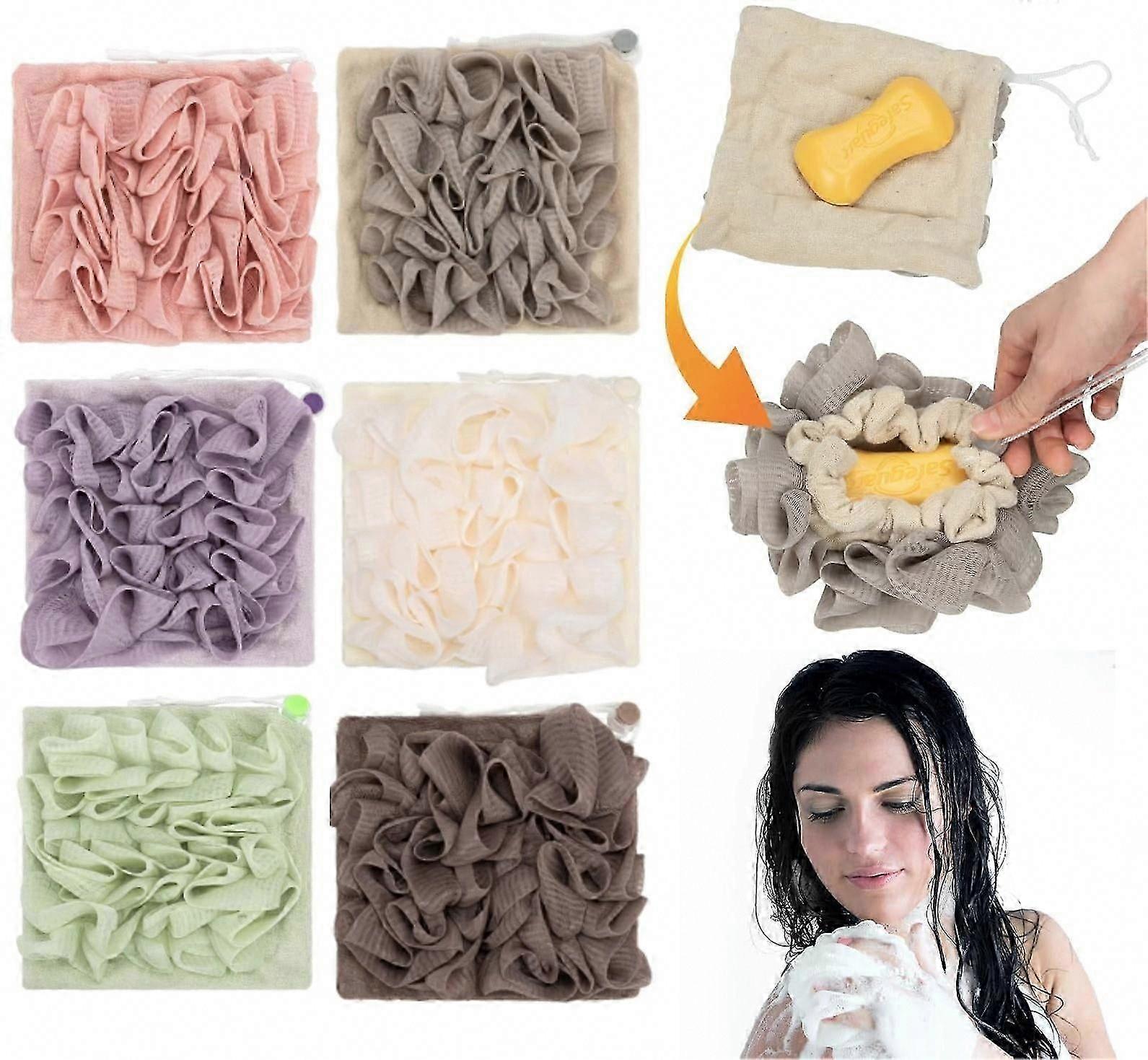 6 PCS 2-in-1 Exfoliating Loofah Washcloth for Men & Women, Fine Mesh Body Scrubber with Drawstring