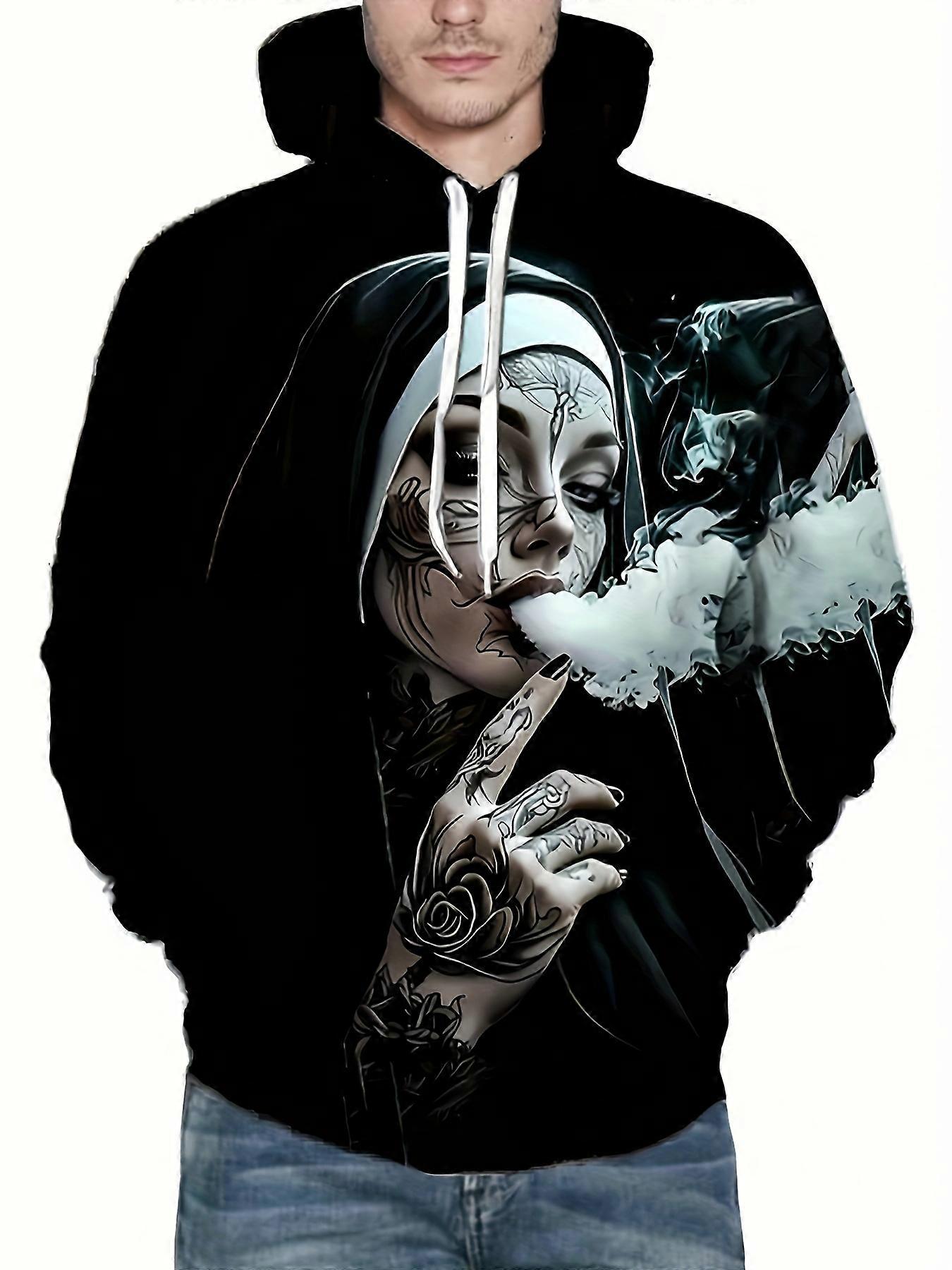 Men's Bold Tattooed Figure Graphic Hoodie Monochrome Art Print Pullover Edgy Statement Sweatshirt