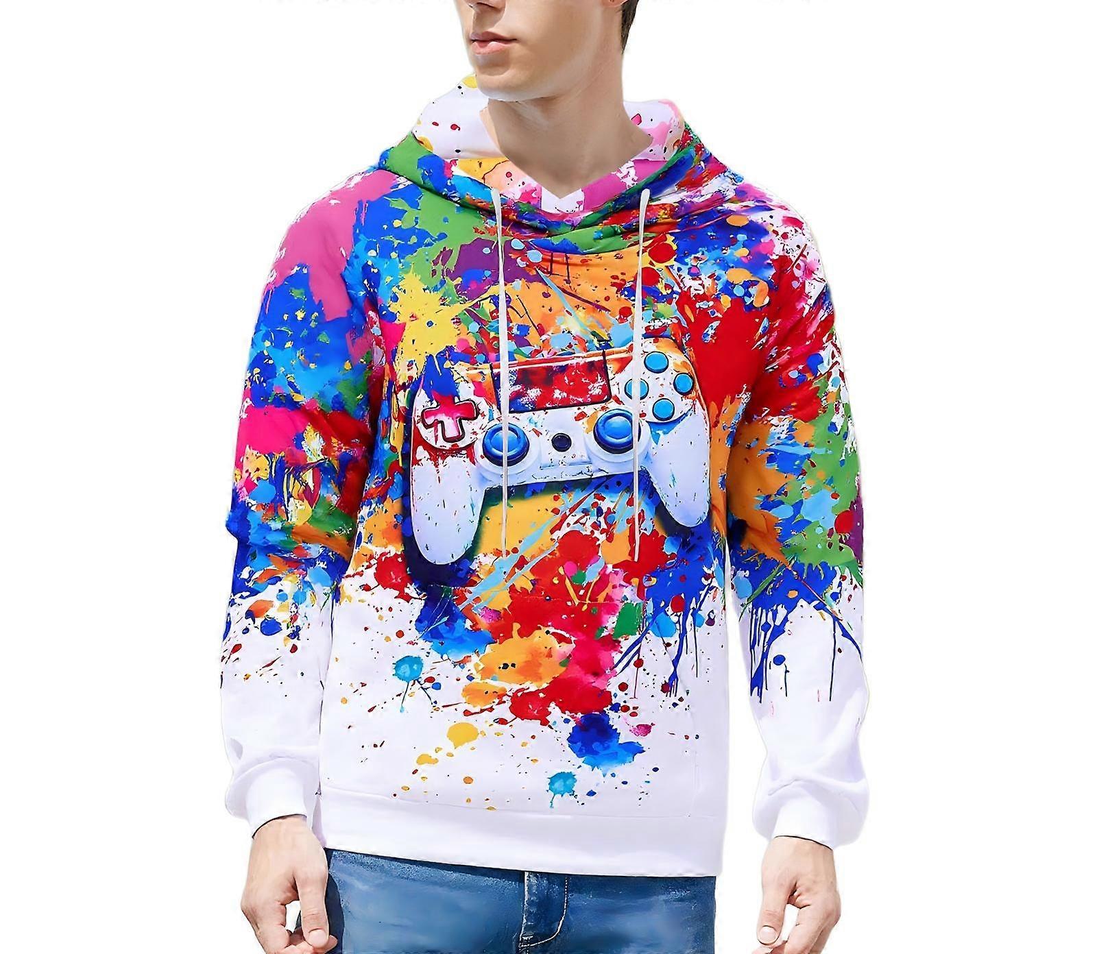 Men's Vibrant Gamer Controller Graphic Hoodie Colorful Splatter Art Print Pullover Casual Streetwear Sweatshirt