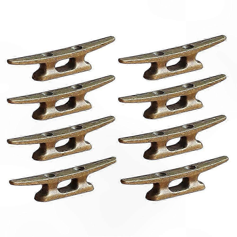 4-inch bollards for securely fastening canoes, kayaks, or other small watercraft to a dock. Made of copper-plated zinc alloy, resistant to humidity, corrosion, and rust. Suitable for DIY projects. Can be used for nautical-style bathroom decoration, towel racks, coat hooks, door handles, curtain rods, awning hooks, and staircase guardrail accents. Two-hole mounting design for efficient installation. High wear resistance and excellent durability. Material: Zinc alloy. Package includes: 8 x boat dock cleats. Screws not included. Color may vary slightly due to screen settings and lighting conditions. Measurement tolerance: ±1–3 cm.