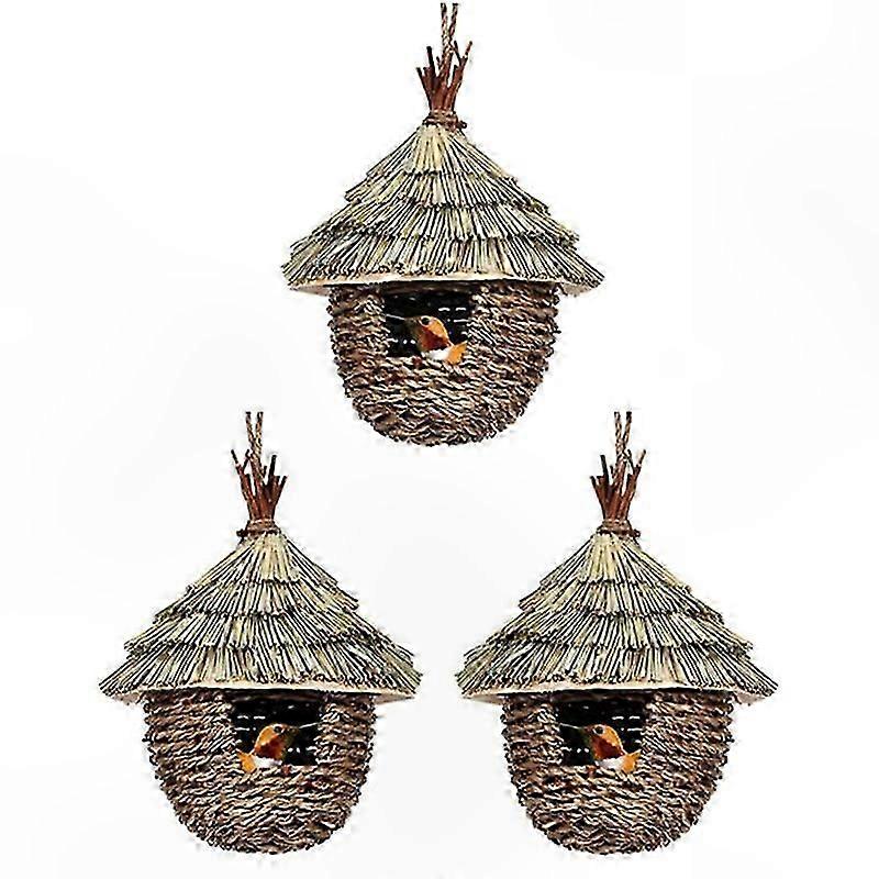 Set of 3 Handwoven Hanging Bird Houses, Natural Grass Nesting Shelters for Garden Wildlife