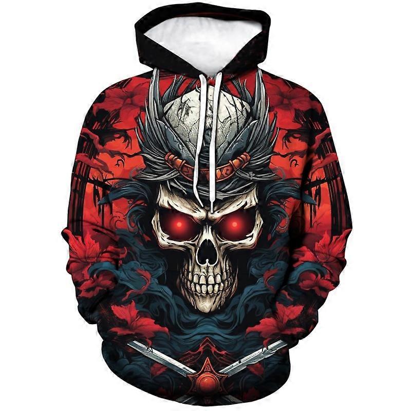 Men's Red Fiery Samurai Skull Graphic Hoodie Dramatic Art Print Pullover Bold Streetwear Sweatshirt