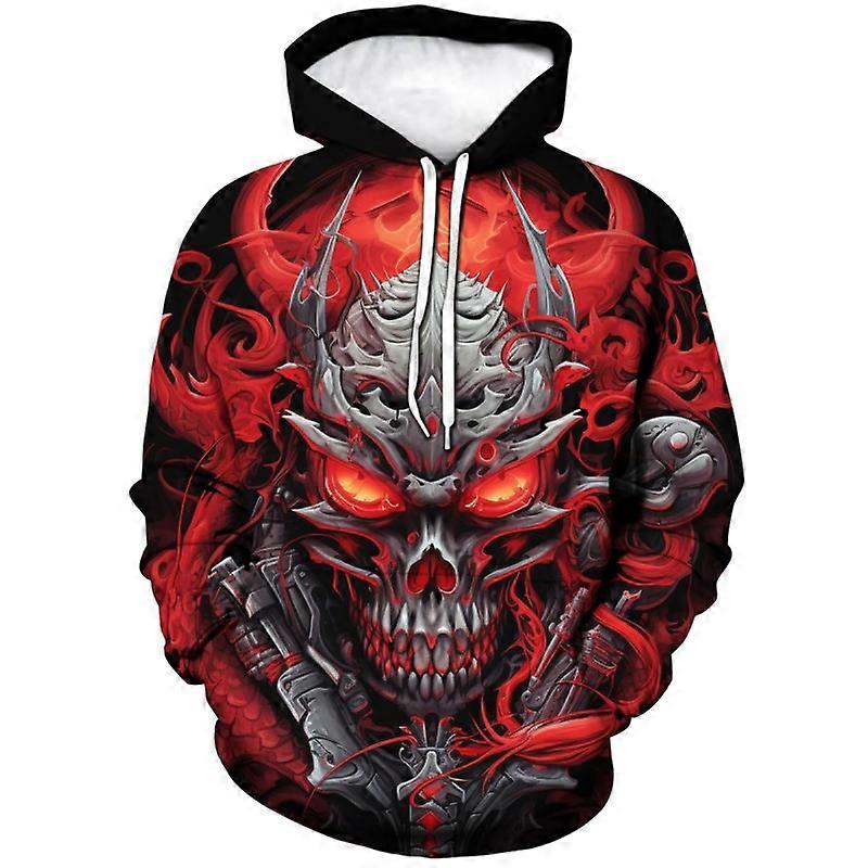 Men's Futuristic Skull & Armor Graphic Hoodie Red & Black Art Print Pullover Edgy Casual Sweatshirt