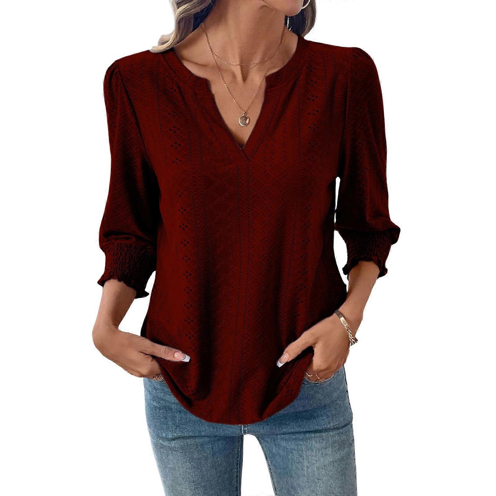 Womens Summer Business Casual Blouses V Neck Short Sleeve Shirts Hollow Out Cute Lace Tops Burgundy XL