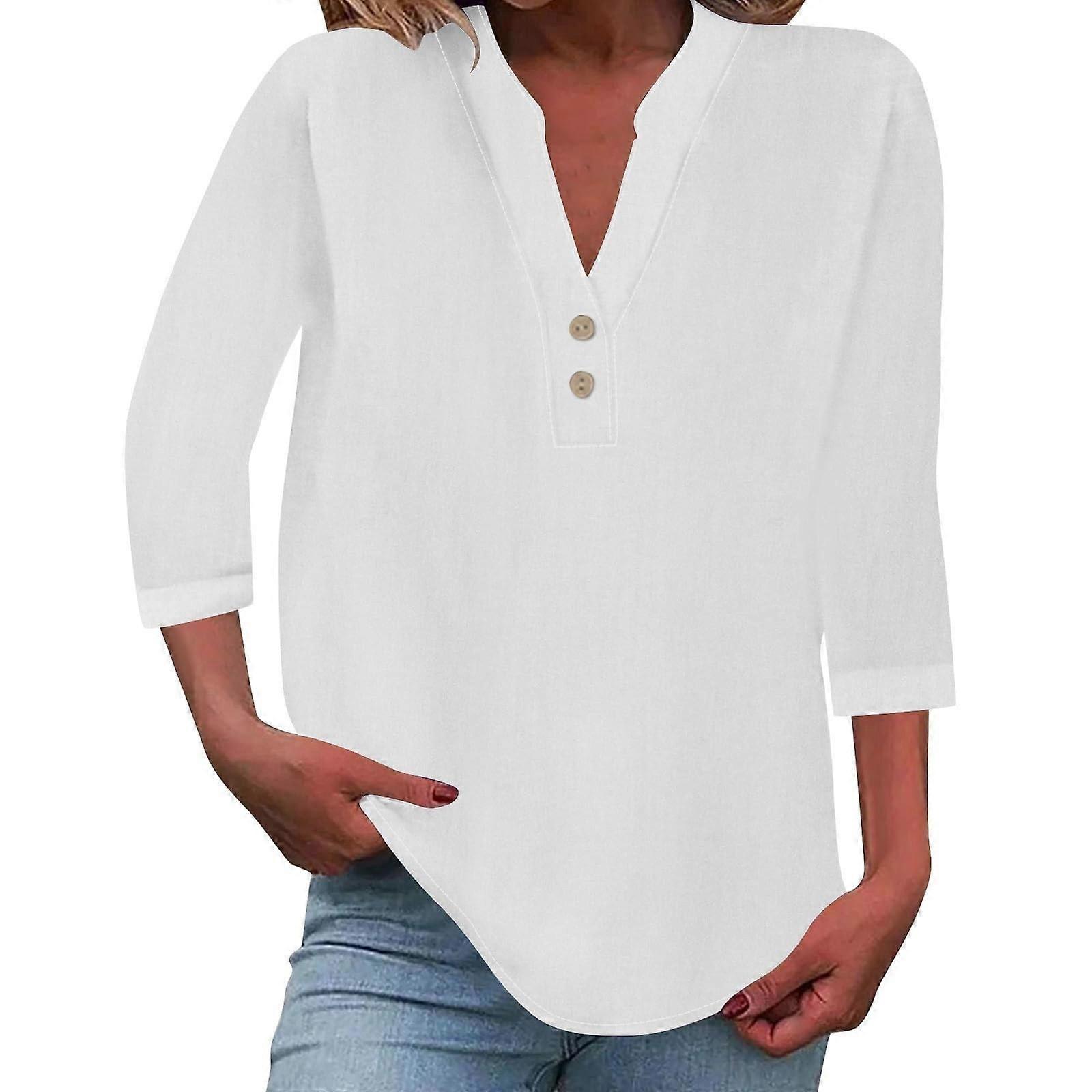 Women's cotton and linen shirt, solid color, three-quarter sleeve, belted waist, casual V-neck, elegant shirt. White XL