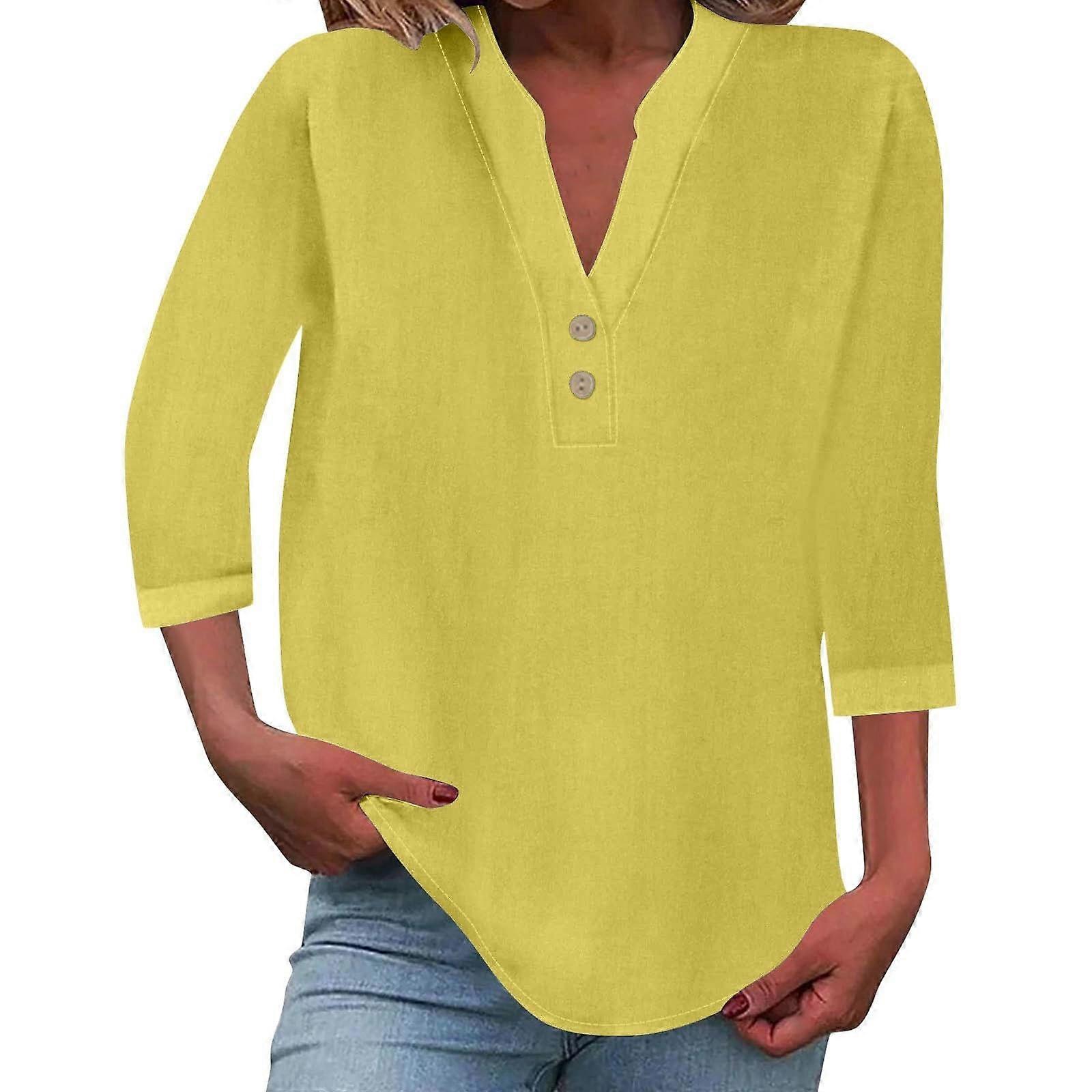 Women's cotton and linen shirt, solid color, three-quarter sleeve, belted waist, casual V-neck, elegant shirt. Yellow XL
