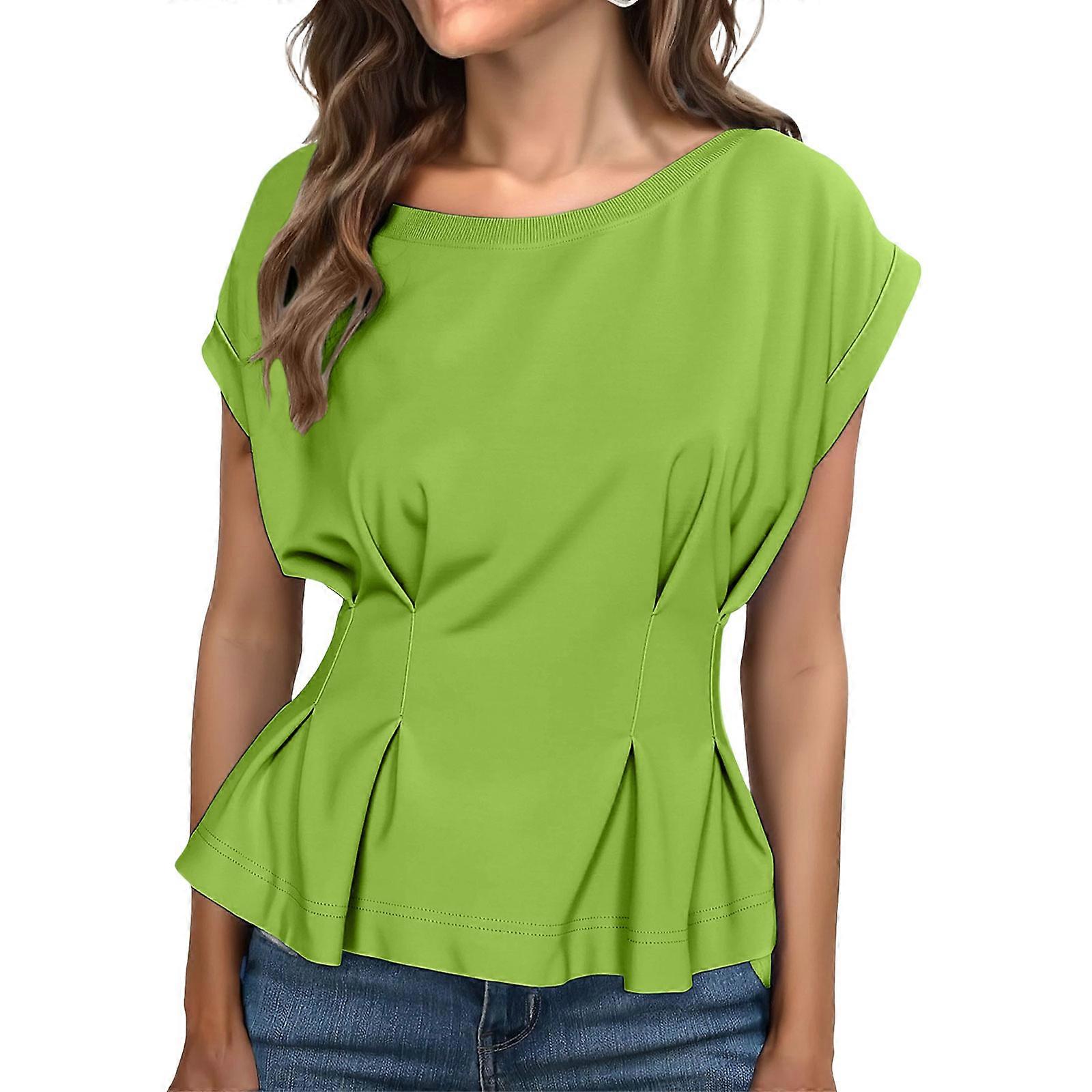 Women's ruffled top, summer babydoll blouse, short-sleeved T-shirt, casual round neck pleated shirt Yellow green XL